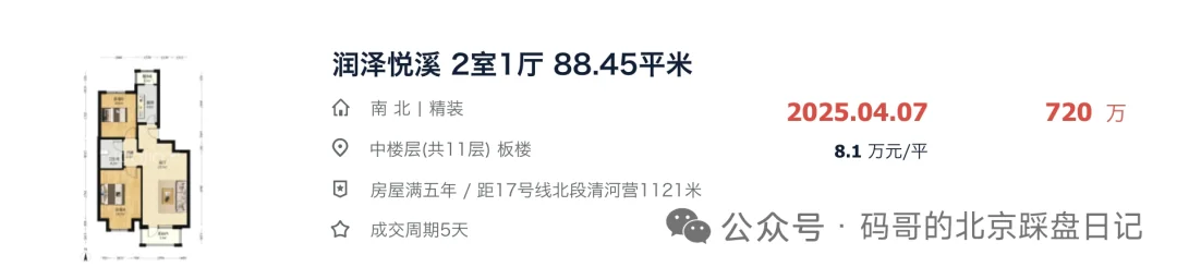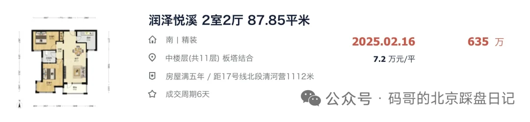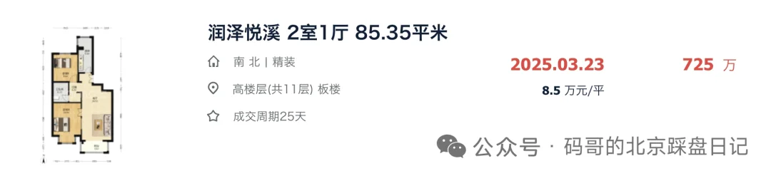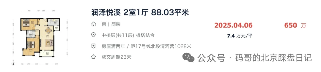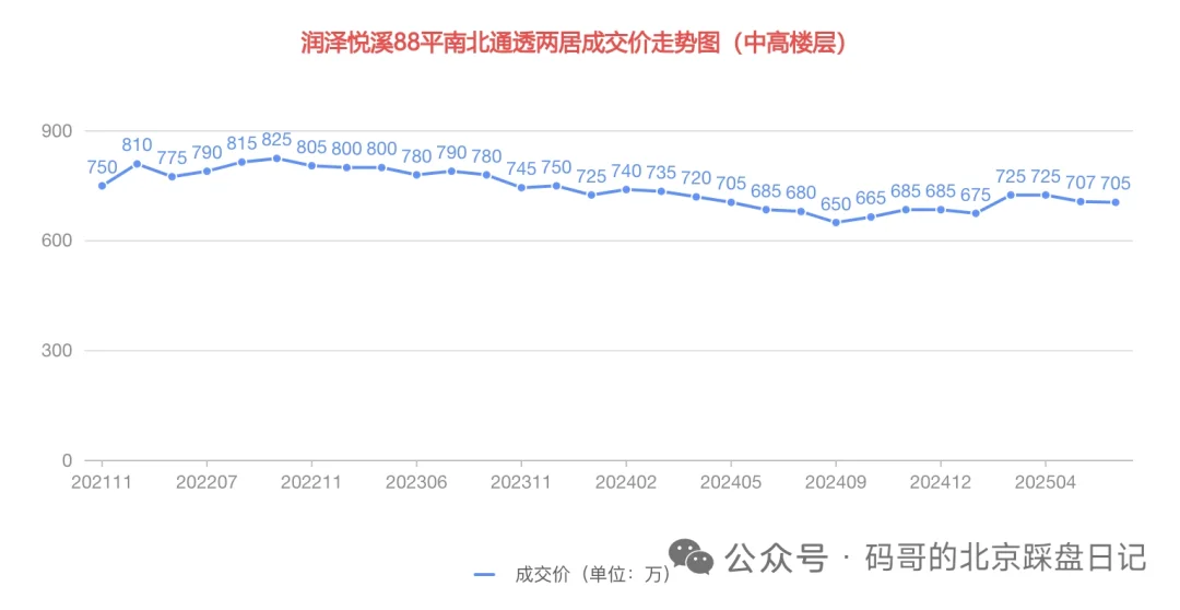 ② 930后的成交高峰,最优质的88平南北通透两居室价格迅速上升,基本每个月价格都在涨,到了2025.4月初,绝对涨幅70万,涨幅比例超过了10%,这个涨幅超过了北京绝大部分的次新小区,表现非常优异。不过全南两居价格没怎么涨,也算是符合预期,毕竟同小区内最后下跌以及最先上涨的,一定是小区内最好的户型,所以能买好户型尽量买好户型。