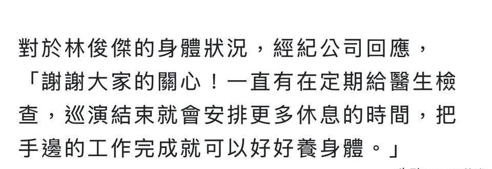 #林俊杰# 演出突然不舒服,爆自己去年4月被诊断心脏出了问题,靠药物维持控制,他说虽然生命的沙漏开始加速了,但他表示会更加好好努力,对得起歌迷的支持。 对于林俊杰的身体状况,经纪公司回应, 「谢谢大家的关心!一直有在定期给医生检查,巡演结束就会安排更多休息的时间,把手边的工作完成就可以好好养身体。