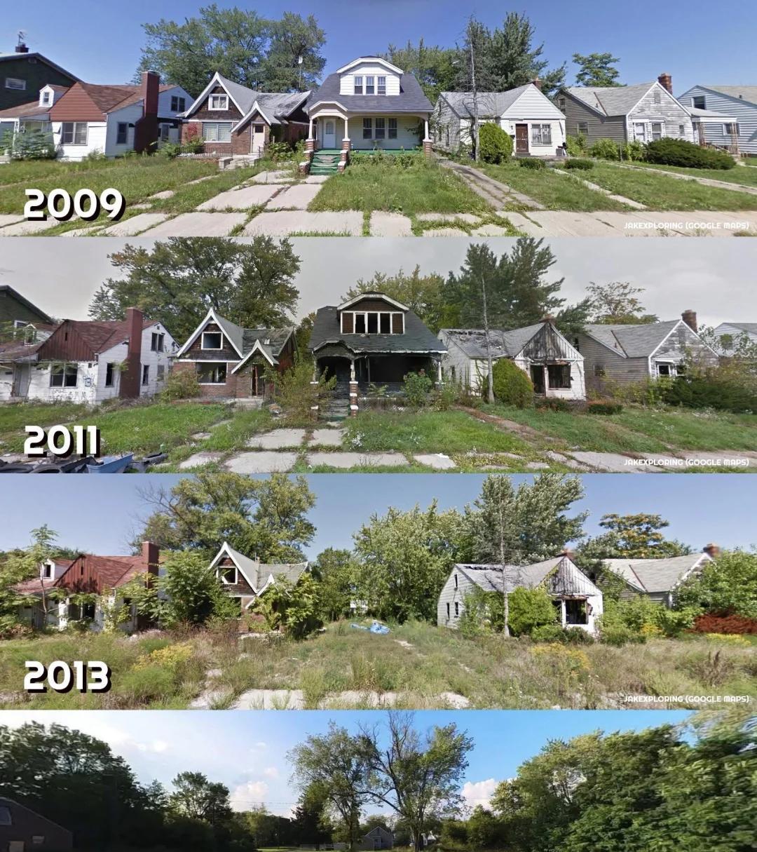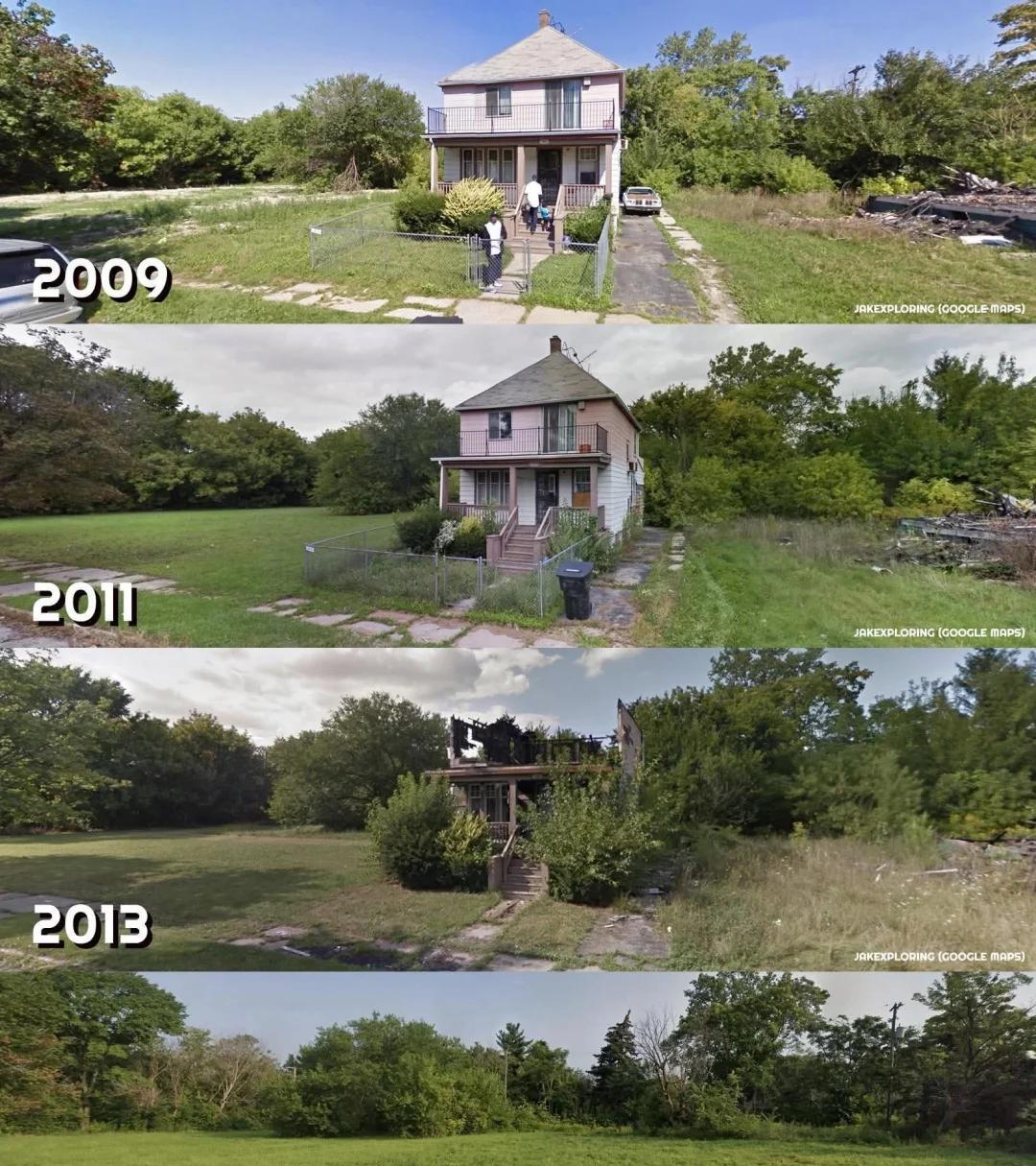 发现没,只要是房子,就需要人气 就算是美国的别墅也会衰败, 尤其是没有人住的房子[发怒][发怒] 时间稍微长一点, 房子周边的杂草就会疯长, 慢慢会长到房子里面去, 过个5-10年,房子就消失了,[捂脸][捂脸] 如图2,2009年-2022年的惊人变化, 这栋两层民宅2009年还有人住, 到了 2011年,园中杂草开始丛生。 转眼2013年的时候, 屋顶被掀跑,院落及周边荒废。 最后2022年的照片,房子没了, 似乎一切归于大自然, 除了几块入户的踏脚石,[笑哭][笑哭] 对于你们比较懂建房的朋友 如果想在老家建房,又不住的情况 还有必要建房吗? #晒图笔记大赛##万能生活指南# #记录我的2025#