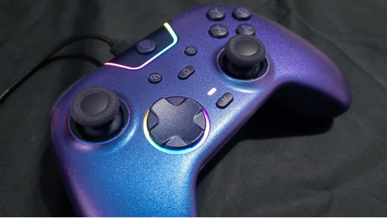 除了配色不同外,X05 Pro和前代X05相比正面看外观几乎没有变化,只是把LOGO指示灯做成了一个单独的指示灯放在M功能键的上方,并且把传统的分离式十字键换成了操作精度更高的圆盘式八向十字键。另外,还保留了RGB灯效,只是从摇杆RGB灯环变成了HOME键和十字键周围的灯带。灯光的亮度和效果自然也是可以调节的,如果觉得费电那就直接关掉就好了。