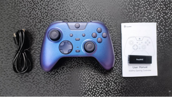 配件方面还是很齐全的,比如现在入门级手柄“不常见”的说明书和Type-C数据线也都给安排上了,当然还标配有2.4G接收器且贴心的给接收器带了个盖,后续应该还可以加购配套的智能启停底座。