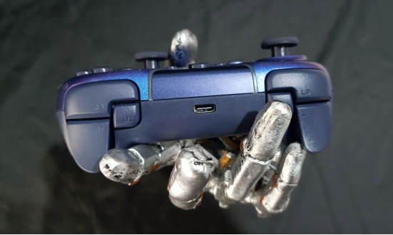 既然是刚上架的新品,这次就不跳过手柄外观介绍了。首先是这款手柄首发有黑色和白色两以及限定色共三种配色,当然我认为手上这个限定色颜值是最高的,通过特殊的工艺不仅在面壳上留下了大量“闪粉”一样的东西,在不同角度下手柄的颜色也会发生改变,比如关灯后在显示器的照射下会呈现出紫色,还是挺有意思的。