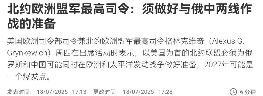 法新社7月18日消息说,北约欧洲盟军司令格林克维奇指出,北约必须做好与中俄发生冲突的一切准备工作,而且这种冲突可能会让北约两线同时作战。 格林克维奇强调,这种冲突最可能发生的时间在2027年。 事实上,可以看出,北约欧洲盟军司令格林克维奇的这种说法,充满了一种高高在上且非常傲慢的态度。 但是对于北约来说,这种说法其实就是一种吹牛而已。北约敢下场吗?不要说和中俄两线作战,就连直接和俄罗斯作战,北约都没这个胆子。 俄乌战争打了三年多,北约只能躲在幕后给以武器和情报等的支持,并不敢下场。就连乌克兰想加入北约都被美国阻止,美国认为处于战争中的乌克兰会把北约拖入战争。 而这个盟军司令说我们的原因,是提到了台海。但是,在这个问题上,北约更不敢直接动手。只不过是想通过这种方式,让北约成员国更加多地增加军费开支而已。