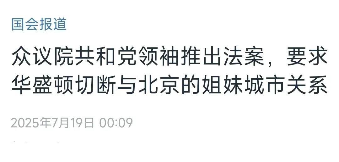 美国议员急眼了!来自美国媒体7月18日消息说,美国众议院共和党议员穆勒纳尔等人提出一项法案,要求华盛顿断绝与北京姐妹城市关系。 事实上,这样的做法,再次表明这些美国共和党议员是真的急眼了,又出来找麻烦了。妄图通过这种方式,来对我们进行再一次切割。 但是,从本质上来说,这无法改变任何现实。对于美国部分议员来说,他们急眼的是,我们的快速发展让他们无法接受,世界头号强国地位受到了挑战,这让他们根本无法忍受。 所以,处处围堵,到处找事,这就成了美国的常态。癫狂的状态已经到了最后阶段。 只是美国议员们应该明白,这些都改变不了任何美国衰落的事实,只是凸显了他们内心的恐慌。