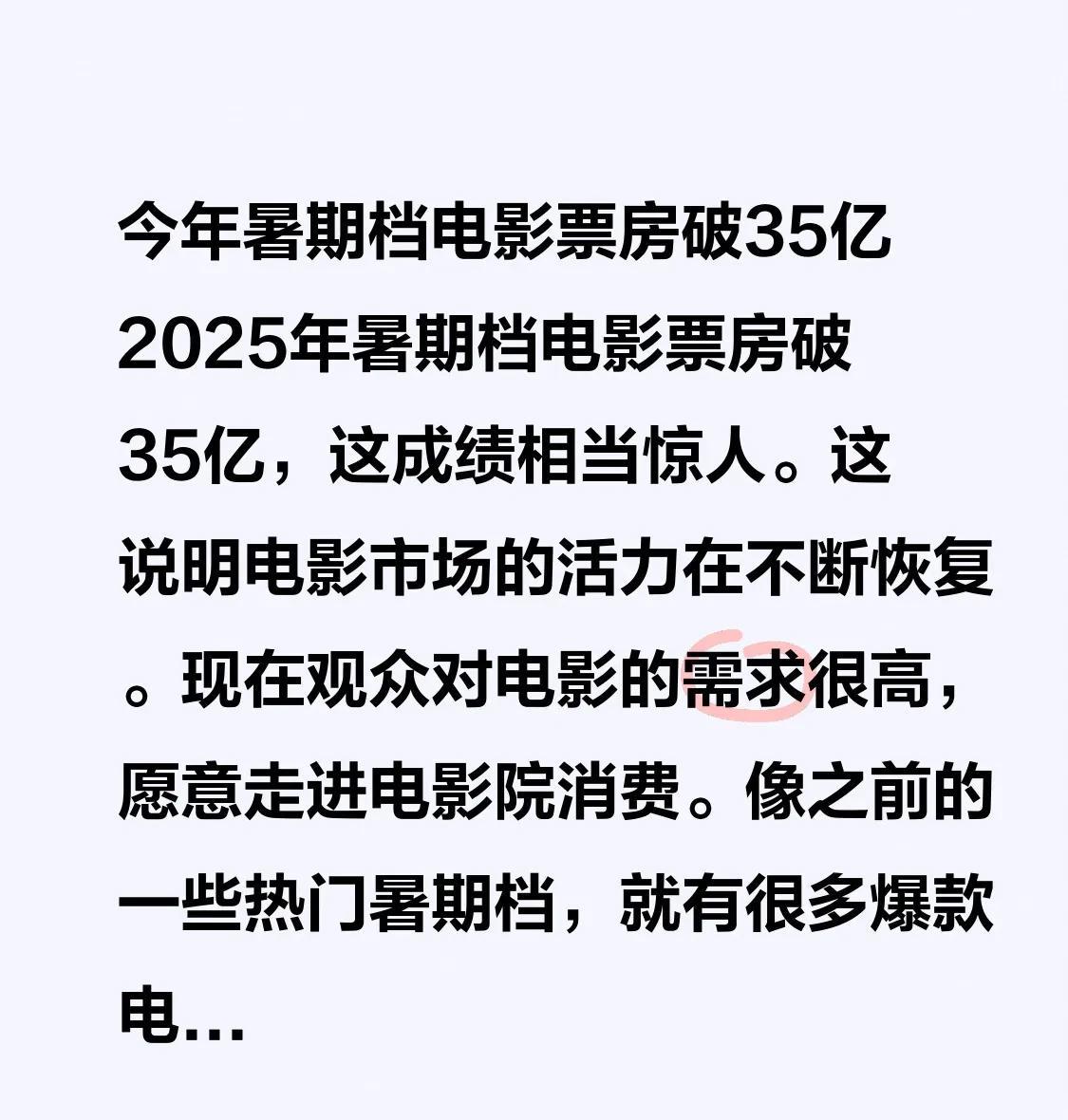 今年暑期档电影票房破35亿 今年暑期档电影票房突破35亿,就连2025年暑期档电影票房也达到了35亿,这一成绩着实惊人。这表明电影市场的活力正在持续复苏。如今,观众对电影的需求极为高涨,乐意走进电影院消费。就像以往的一些热门暑期档一样,涌现出了众多爆款电影。这35亿的票房,或许是各类电影共同的贡献,动作片那刺激的场景、喜剧片的诙谐情节、爱情片的浪漫故事,都在吸引着观众。并且,随着电影制作水准的提升,特效大片日益增多,观众也更乐于为高品质的视听享受付费。期望后续的暑期档电影能够继续维持热度,带来更多的惊喜。