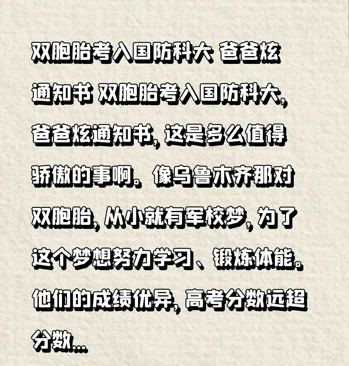 双胞胎考入国防科大 爸爸炫通知书 双胞胎考入国防科大,爸爸炫耀通知书,这是多么令人骄傲的事情呀。 就像乌鲁木齐的那对双胞胎,打小就怀揣着军校梦。为了这个梦想,他们努力地学习知识,不断地锻炼体能。他们的成绩相当优异,高考分数远远超出了分数线,体能也从薄弱变得强壮起来。其他地方的双胞胎也是这般情况。 这既是家庭的荣耀,也是他们自身努力所得到的回报。爸爸们炫耀通知书,其实是在自豪地展示孩子的成就。这样家庭培养出来的孩子,日后进入国防科大,必定也会成为出色的人才,为国防事业贡献自己的力量。 #国防科大排名# #追梦科大# #萌娃梦想国科大#