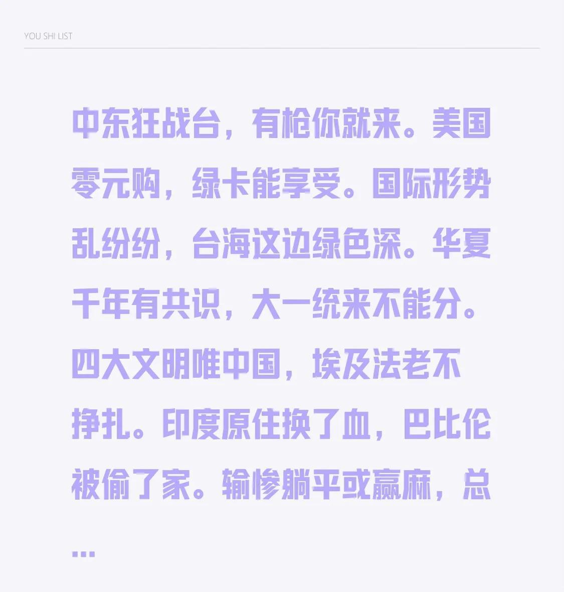 中东狂战台,有枪你就来。 美国零元购,绿卡能享受。 国际形势乱纷纷,台海这边绿色深。 华夏千年有共识,大一统来不能分。 四大文明唯中国,埃及法老不挣扎。 印度原住换了血,巴比伦被偷了家。 输惨躺平或赢麻,总之速速要生娃。 人多未必力量大,基因狂飙胜征伐。