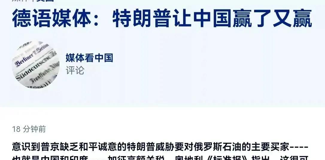 德国媒体发出罕见警告!针对当前美国向购买俄罗斯石油的国家加征100%关税的政策,德国媒体公开指出,特朗普的关税政策损人不利己,将会让中国成为赢家。 德国媒体强调,如果向中国商品大幅加税,影响的是美国自身,美国应该慎重。 事实上,美国这次所谓的对俄罗斯的制裁措施,其中一条就是对购买俄罗斯石油的国家加税100%。这就意味着,大量购买俄罗斯石油的印度和中国成了首当其冲的对象。 但是,德国媒体早就看清楚了,美国向中国加税是占不到便宜的,而且还会加速中国的发展。这一点在前一阶段的关税战中已经得到了验证。手握大量美国的美国,面对没有来自中国的商品供应,却是一点办法都没有。 所以,德国媒体看得很清楚。 不过,美国这样的说法,也就是说说而已,他们是不敢真正这样做的。