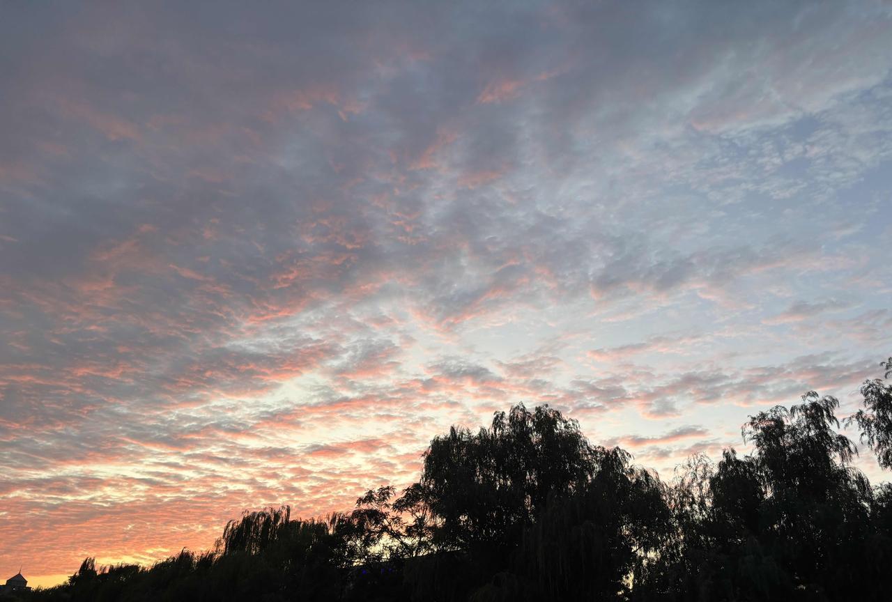 火烧云的形成原理: 火烧云的红色调源于太阳光的瑞利散射原理。当太阳接近地平线时,