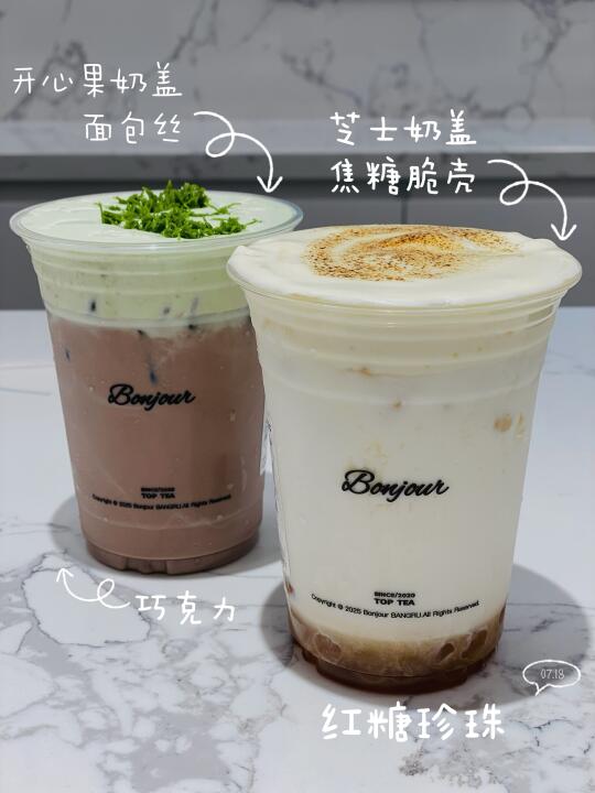 ❤️一下班就冲过过来了,法式风情的装修,氛围也太好了吧!饮品种类很多,奶系、果系都能找到你的爱! ✅招牌浮云鲜牛乳☁️ 🥛鲜牛乳打底,🧀表面覆盖一层用火枪现烤的焦糖芝士奶盖,拿到手就喝还有脆壳哦!入口丝滑,奶香浓郁,🍡搭配软糯Q弹的红糖珍珠,口感丰富!!! ✅凡戴克棕巧🍫 液体版网红迪拜巧克力,开心果奶盖➕面包丝➕香浓牛奶巧克力,一整个hold住! ✅青梅冰椰海🥥 清新的椰汁里有duang duang的青梅冻冻,还有青梅颗粒,越咀嚼越有味道,冰凉沁爽,也太适合夏天了吧! ✅酸木瓜特调🍋 酸木瓜和香水柠檬的搭配,酸甜可口,超爽!!! 🏠 BONJOUR本就(南京金陵天地店) 📍 友谊街72-104号南京金陵天地L167号商铺 本就南京金陵天地南京美食新店开业本就茶饮南京茶饮南京探店奶茶南京攻略南京吃喝玩