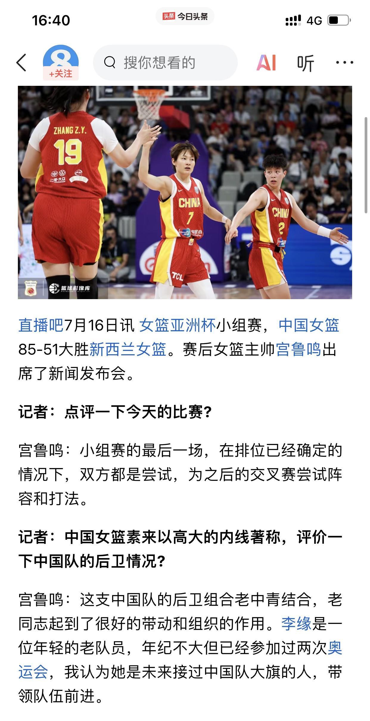 建议宫鲁鸣下次须重用李缘,不然还得输球! 我为何这样说? “李缘年纪不大,但已经是参加了两届奥运会的年轻老队员,未来她是要接过中国女篮大旗的,带领中国女篮前进的球员!”(请看图二) 看看,评价多高啊! 既然评价这么高,这么认可李缘,那为什么半决赛打日本,只让李缘打3分钟? 那一刻,不应该让李缘带领中国女篮前进吗? 难道一个进了中国女篮国家队长达7年之久、一场大赛都未落下的李缘,还没有达到他口中所说的扛大旗的时候吗? 说真的,虽然我明白了为什么输球! 但是我搞不懂中国女篮现任主教练为何在说完这个话后的第三天,又是那么关键时刻,却不把重任交给李缘,不然何至于输给日本女篮! 因此,我作为一个关注中国女篮多年的观众,真是气啊!