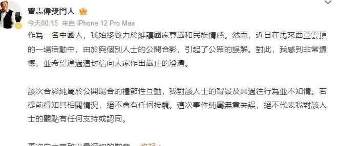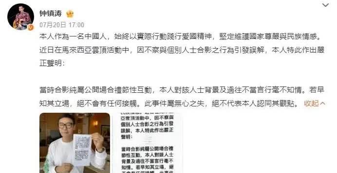 刚刷到俩老港星排队道歉,原来是在马来西亚云顶商演时,跟那位“反华常客”黄某志同框被拍。钟镇涛、曾志伟连夜发声明:若早知是他,绝不合照。网友辣评“连道歉信都撞模板,谁抄谁?”笑归笑,艺人海外走穴被挖坑也不是第一次。你说,合影前到底该不该先背调?