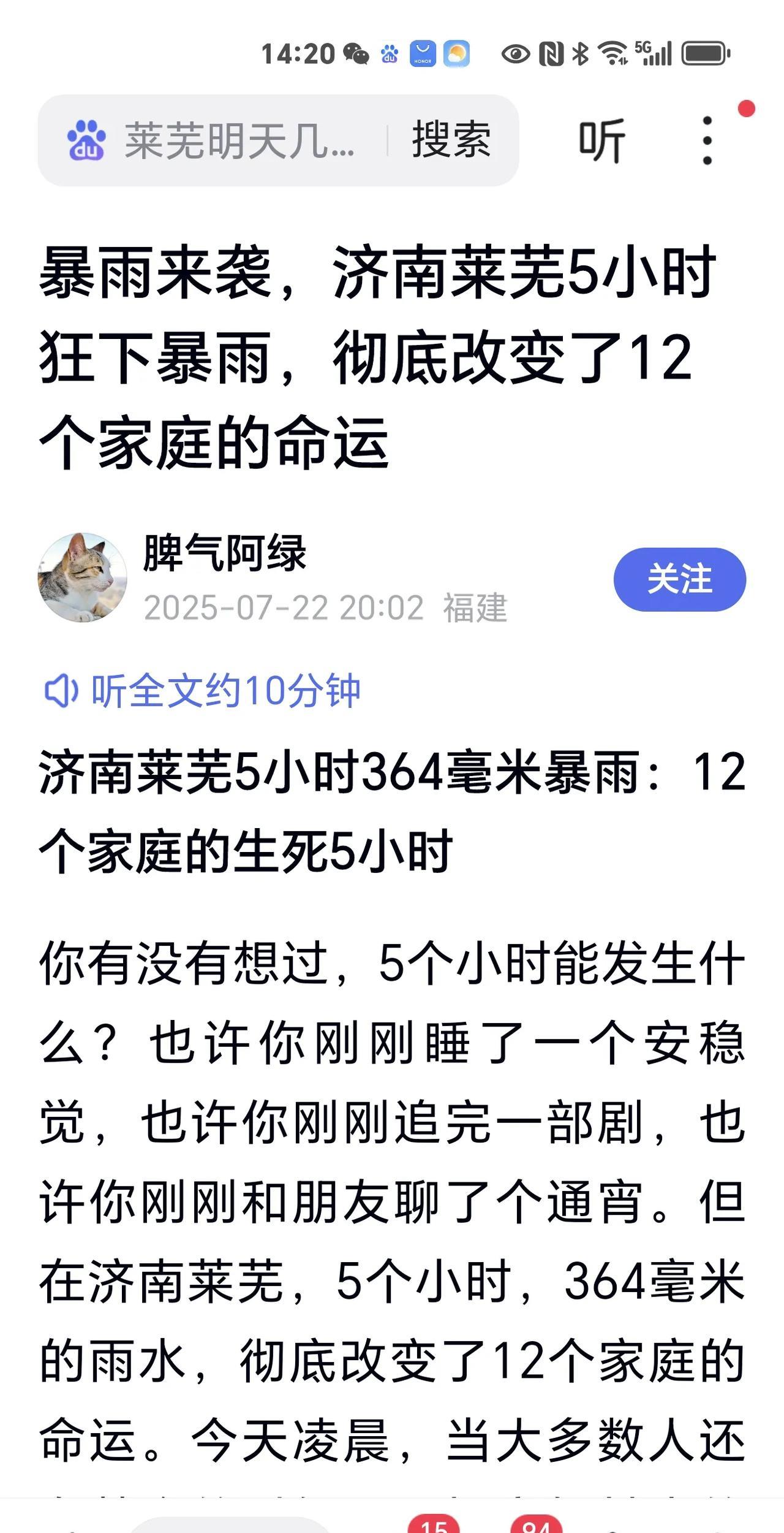 午睡中又闻阵阵雷声和雨声。这种因台风下雨凉快的时候,也常会带来洪涝灾害。莱芜一个