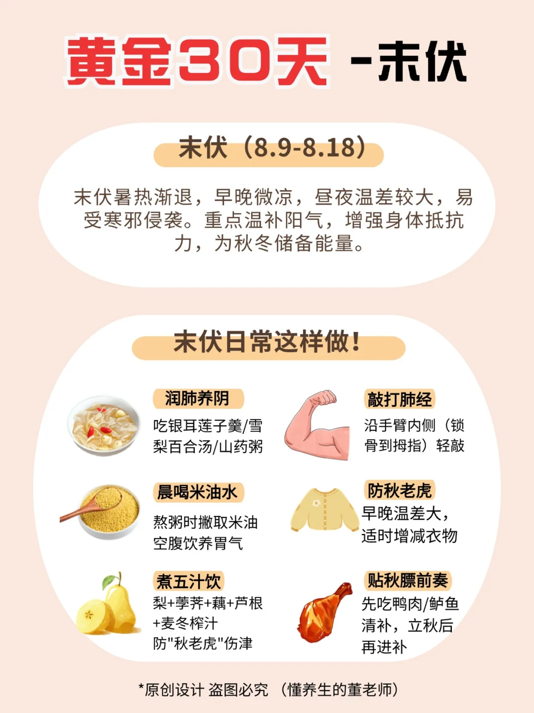宝子们,末伏(8.9 - 8.18)来啦,暑热渐渐退去,早晚开始有点凉意,昼夜温差大,咱们要重点温补阳气,为秋冬储备能量。