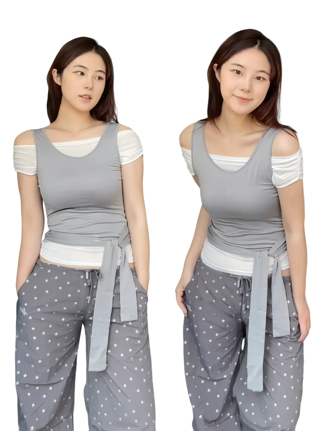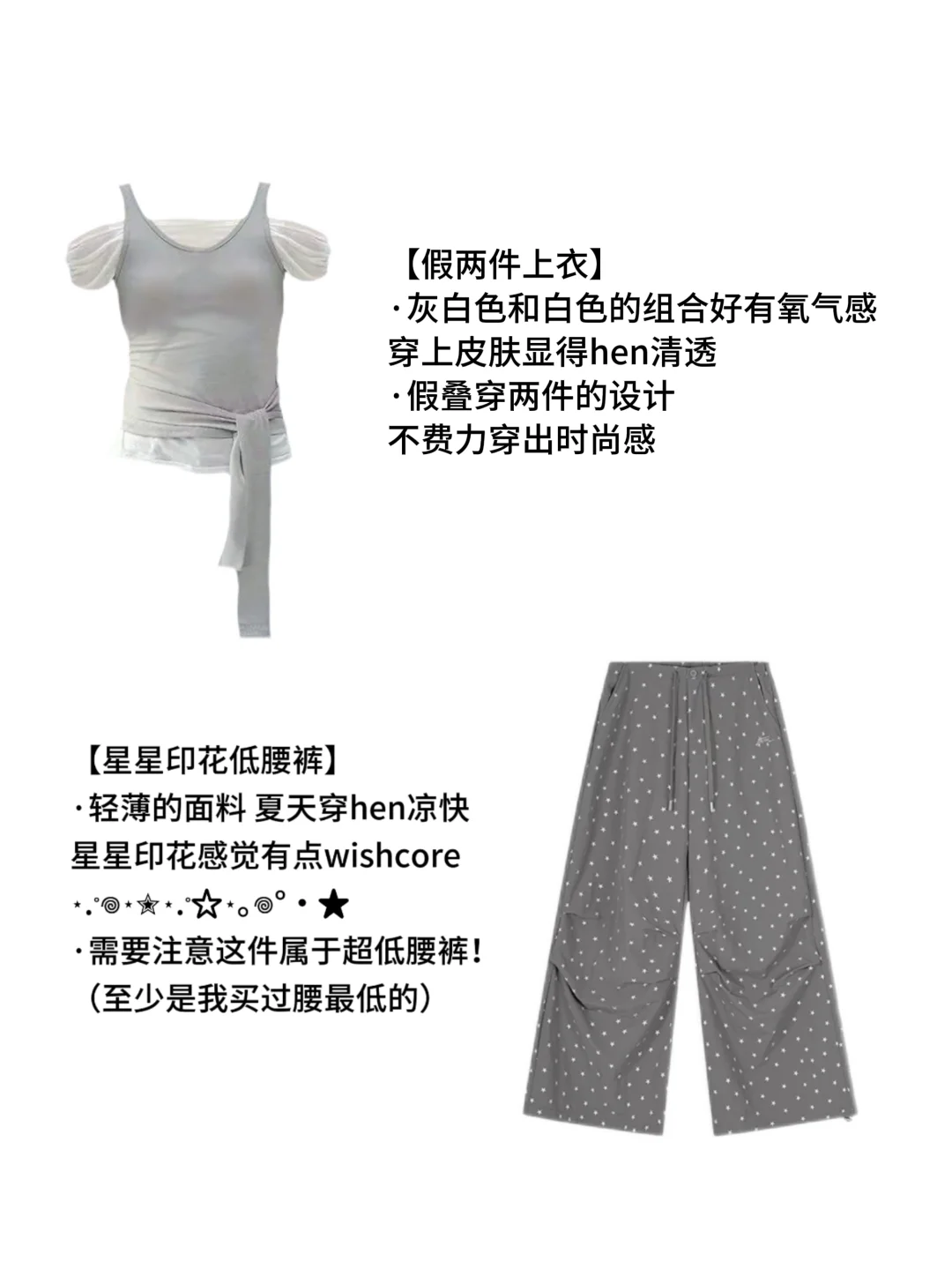 ★【假两件上衣】 ·灰白色和白色的组合好有氧气感 穿上皮肤显得hen清透 ·假叠穿两件的设计 不费力穿出时尚 ★【星星印花低腰裤】 ·轻薄的面料 夏天穿hen凉快 星星印花感觉有点wishcore ⋆.˚𖦹⋆✮⋆.˚☆⋆。𖦹°‧★ ·需要注意这件属于超低腰裤! (至少是我买过腰最低的)