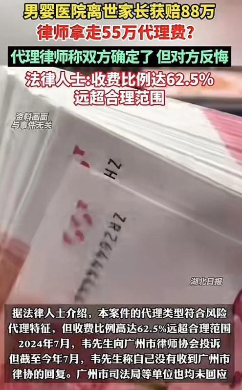 男婴在诊所离世,父母获赔88万,结果律师拿走55万代理费!父母:“我文化水平低,事后才意识到代理律师骗了我!代理律师:双方确定了,但对方反悔!法律人士:收费比例达62.5%,远超合理范围! 信源:湖北日报 独子小韦,因发烧咳嗽被带往广州某社区诊所就诊,医生为其开了感冒药并注射一针退烧针。然而仅两个小时后,小韦突然昏迷,抢救无效在诊所内死亡。 悲剧发生后,韦先生夫妇痛不欲生,既伤心,又感到无助。他们文化程度不高,面对复杂的医疗纠纷,根本无从下手。为了讨回公道,他们决定请一位律师帮忙。 他们找到了广州某律所的邓姓律师。 最初,韦先生夫妇表示自己经济困难,交不起高昂的律师费。邓律师提出,可以“先办案后收费”,但具体收费细节并未明说清楚。双方口头达成共识:等到案件结案拿到赔偿后再支付律师费。 在邓律师的代理下,案件进入司法程序。司法鉴定认为,诊所一方承担次要责任,而家属也有一定责任,比如延误送医、没有及时呼叫120等。 按通常医疗纠纷的判例,这样的责任比例大概只能获得约30万左右的赔偿。 但邓律师通过多次沟通、取证,最终帮助韦家在2024年2月达成调解协议,诊所同意一次性赔偿88万元。韦先生一开始感激涕零,觉得律师确实帮了大忙。 可没想到,他们清醒过来、看到银行卡进账仅33万元,再看看调解书上的金额才恍然大悟——原来律师拿走了整整55.5万元,占比超过六成! 韦先生这才意识到不对劲,向广州律师协会递交了书面投诉材料。 可自2024年3月递交后,直到7月,韦先生都没有收到任何书面回复或电话说明。他多次打电话咨询,得到的回应总是“还在调查”“流程尚未结束”。 无奈之下,韦先生只得向媒体求助。他们将事情的来龙去脉一一告知记者,并将他们与邓律师之间的聊天记录、签字材料和汇款凭证全部交出。 记者调查后发现,韦先生夫妇与邓律师之间确实没有签署过“风险代理协议”,只有在案件结束后,邓律师才拿出一份补充协议让他们签字确认。 这份补充协议中并未明确收费依据,仅写明“委托人同意支付律师代理费人民币55.5万元”。 面对质疑,记者联系上了邓律师本人。他表示:“案件不是风险代理,是正常代理模式。我们为当事人争取到了主责赔偿,这是极其不容易的事。 如果没有我们介入,他们最多拿到30万。我们和他们事前有沟通,是他们事后反悔了。” 但邓律师的这一回应并未获得公众认同。不少法律业内人士指出:即便律师在代理过程中确有付出,也应当遵守行业收费规范。 根据广州市司法局及律师协会的指导意见,医疗纠纷类案件一般律师收费标准在5%~15%之间,即使是风险代理,也应提前签署书面协议,且收费比例不得超过30%。 “本案律师费高达62.5%,远远超过合理区间,而且是在当事人极度脆弱和丧失判断力的情况下‘补签’的协议,明显存在违背公平自愿的嫌疑。”一位不愿具名的法律专家表示。 此事经媒体曝光后,引发了网络上的轩然大波。大量网友留言: “人家孩子死了,才拿到33万,律师拿走55万?这是在割人心头血!” “我知道律师费贵,但这不是贵,是黑!” “父母没文化不代表你可以欺负人!这比碰瓷还狠。” 有网友还翻出广州律协官网,发现该律所并非第一次被投诉,有过多起涉及“高价代理”的前科,但都不了了之。 “像韦先生这样的当事人,文化水平低、法律意识薄弱,又处于巨大精神打击之中,更需要规范和透明的法律服务。” 广东省某高校法学院教授表示。 他呼吁,广州市律协应当尽快介入并作出公开处理结果,而不是长期“沉默”。“如果不处理这类过度收费行为,长远来看会严重破坏公众对法律行业的信任。” 目前,韦先生仍在继续投诉,并表示将向司法局乃至更高部门举报此事。