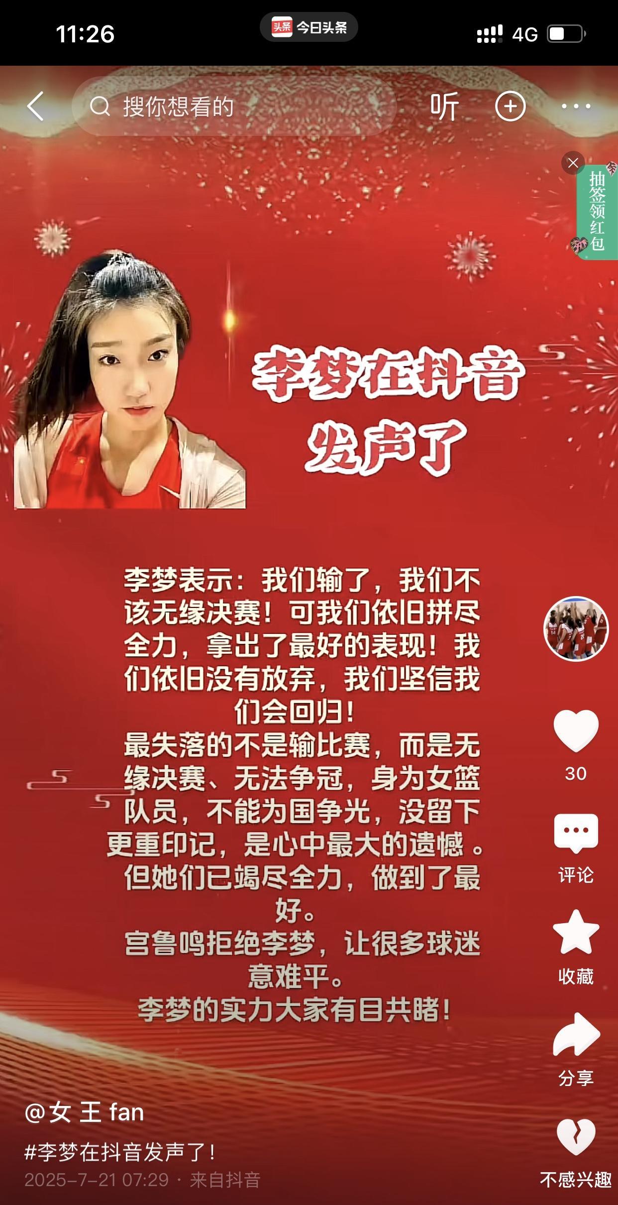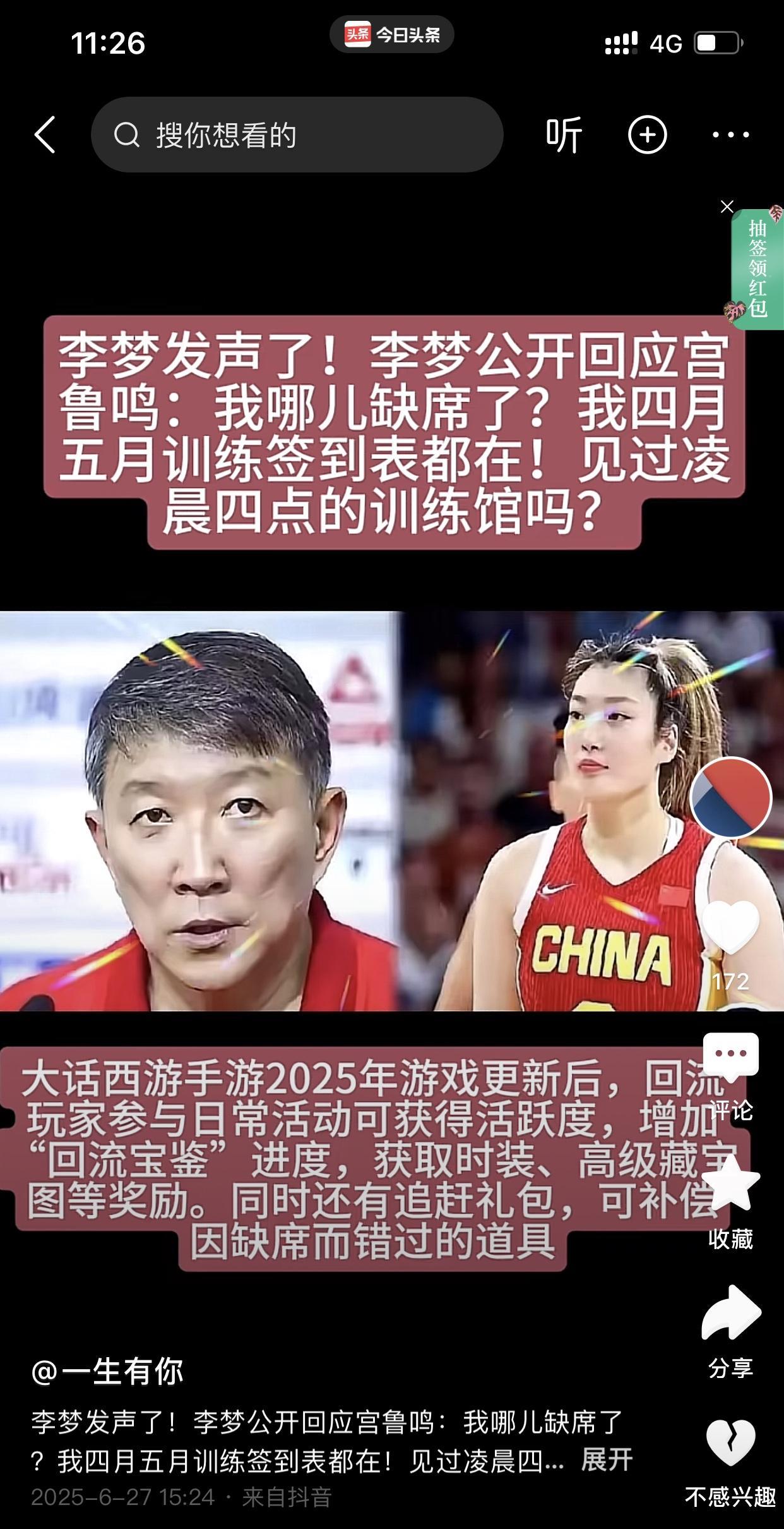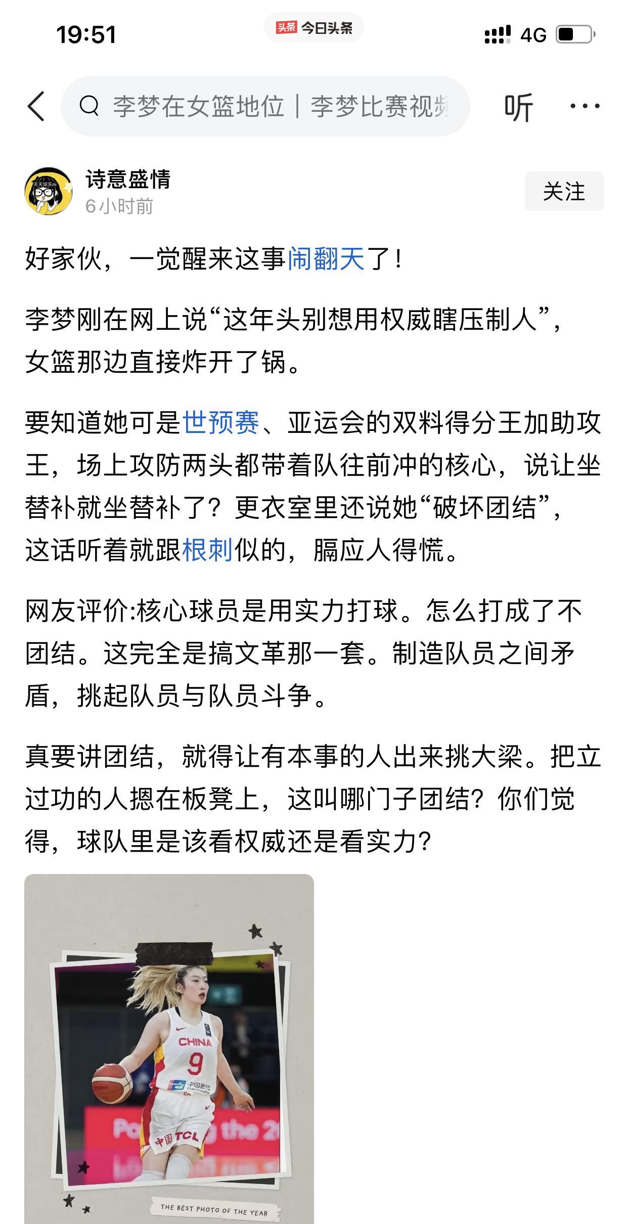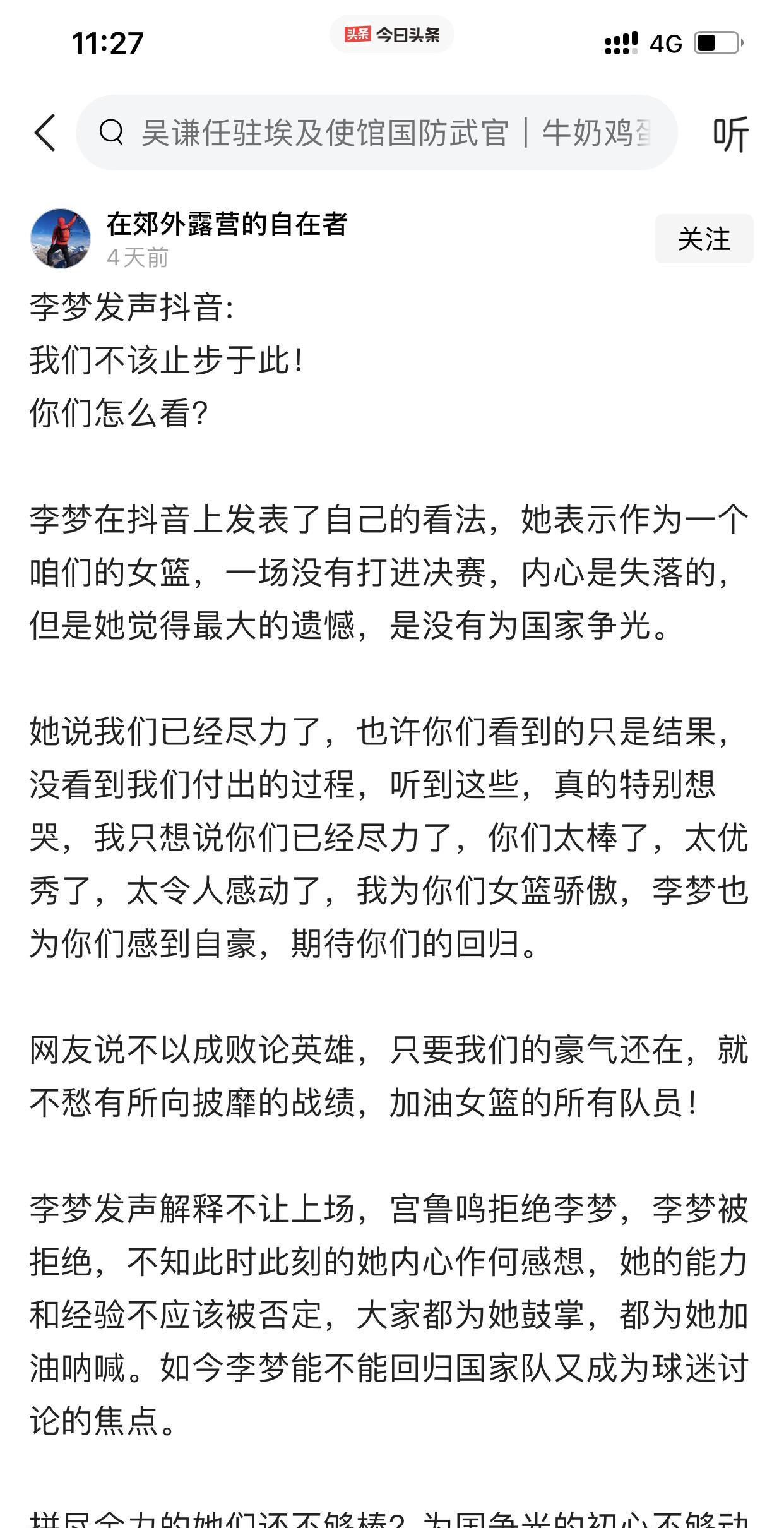 谁能告诉我女篮李梦什么时候发声了? 可是,我特意去搜索了李梦的三个帐号,没有一个帐号有发过新的内容,最新就是6月中旬的那篇相当于告别国家队的发文! 说到这里,我觉得网友有句话说的对! 即只要胡说八道、能吸引人来阅读你的内容,管它什么真假! 其实,李梦没有发声就对了,因为不管是鼓励也好,还是怎么着也罢,都不适合,沉默才是正确的做法! 好了,李梦即将在全运会资格赛亮相,期待淡出国家队的李梦打出精彩的表现!