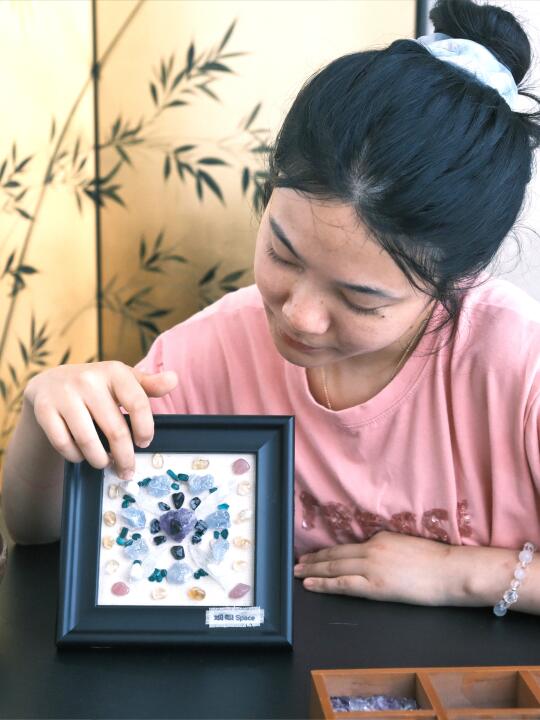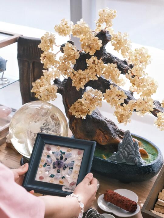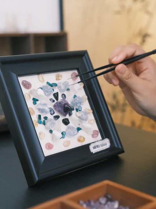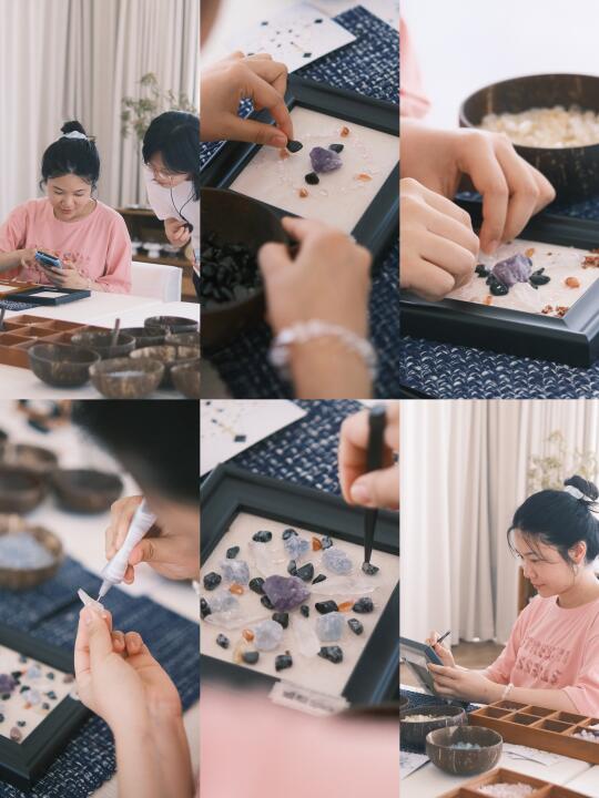 之后开始亲手将属于我的水晶组合,排列进画框里。手指触摸着冰凉温润的水晶,心也变得异常平静。专注于当下,排列、调整…时间仿佛慢了下来,所有杂念都消散了,只有我和眼前的星光点点💫。