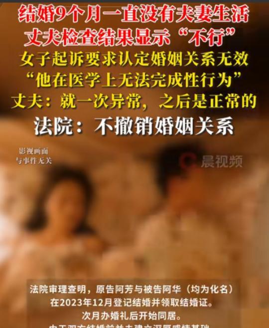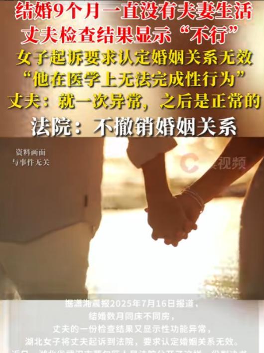 “太炸裂!”湖北,一女子经相亲与一男子结婚,岂料,结婚9个月男子都不碰妻子,妻子认为男子“不行”,上医院检查发现男子“医学上无法完成性行为”,妻子上法院离婚,男子却说“就一次不正常”,法院判决令人意外! 信源:湘潇晨报 湖北孝感,小傅坐在法院外的长椅上,双手紧握,目光有些呆滞,心里一团乱麻。 她才25岁,正是如花的年纪,却被困在一段“形同虚设”的婚姻里,实在想不明白,为什么自己的人生要遭遇这种事。 一年前,在父母催促下,小傅无奈地答应了相亲。介绍人是母亲单位的老同事,说男方全某“老实可靠,有稳定工作,家庭条件不错,最重要的是人品好”。 小傅一开始并不情愿,但架不住父母天天唠叨,说她年纪不小了,该安定了。见了全某几次,发现他话不多,但确实老实,对她也挺照顾。于是两人便在认识三个月后草草结婚。 婚礼办得还算热闹,亲戚们都说:“小傅找了个踏实人,不错。”可新婚之夜,小傅便察觉到有些不对劲。 全某紧张得手脚发抖,最后两人就这样背对背睡了一夜。小傅心想也许是他第一次,紧张可以理解,没放在心上。可谁知,从那之后整整九个月,全某始终与她保持“纯友谊式”的距离。 小傅有几次主动挑明话题,可全某总是推脱:“太累了、工作烦、状态不好……”一开始她还相信,直到有一天夜里,她忍不住问了句:“你是不是根本就不行?” 全某脸色顿时变了,咬牙说:“你懂什么?男人的尊严你能随便质疑?” 小傅愣住了,从那天起,心里的怀疑变成了困扰。她偷偷去妇科医院咨询,医生说也许要丈夫去男科检查一下才能确定。思前想后,小傅终于鼓起勇气和全某摊牌,要求一起去医院做个检查。 全某脸上青一阵红一阵,但最终答应了。几天后,他们拿到了检查报告——全某被诊断为“医学上无法完成正常性行为”,很可能是先天性的。 小傅的心瞬间凉了半截。她愣愣看着报告,觉得自己被骗了。结婚前,全某从未提过这方面的问题,现在想来,之前的种种回避和冷淡,早有迹可循。 她回家和父母哭诉,父母也懵了。“这不成了骗婚吗?”母亲怒不可遏,“你还年轻,不能这样耗下去。” 小傅决定提出离婚。可当她向全某表明态度时,对方竟一口回绝,说:“我又没做错什么,就因为这个你就要离婚?” 小傅瞪着他:“你婚前隐瞒事实,这不是错?你觉得我们这样是夫妻吗?” 全某冷笑:“我就一次不正常,后来就没试了。你给我机会,我能行!” “九个月都不给机会,现在说你能行?” 眼看谈不拢,小傅只好向法院起诉,要求撤销婚姻,理由是对方存在重大隐瞒,导致婚姻目的无法实现。 庭审当天,双方站在审判席上。小傅情绪激动:“我不是嫌弃他,是觉得被骗了!九个月,他对我没有一次夫妻之实!我才25岁,难道要这样耗一辈子?” 全某显得很冷静,甚至有些委屈:“她一直质疑我,攻击我男人的尊严。 我承认,第一次确实不太顺利,但那不能代表我不行。我为了证明,最近又去医院检查了,医生说一切正常,没有生理障碍。” 他当庭提交了新的体检报告,显示其性功能并无障碍,指标都在正常范围内。 小傅一时语塞。她没想到,全某竟然真的去做了第二次检查,而报告确实显示一切正常。 法官沉默片刻后开口:“本案中,被告婚前并未明确隐瞒重大疾病,且目前医学检查并无严重障碍,仅因一次失败就判定其‘不能履行夫妻义务’,证据不足。 婚姻不能因为一次异常就撤销,除非对方有明确、持续性的重大问题,或者婚前明知仍故意隐瞒。原告提出撤销婚姻的请求,本院不予支持。” 小傅听到“驳回请求”那一刻,几乎崩溃了。她眼里含着泪问:“那我怎么办?真的要这样过下去?”