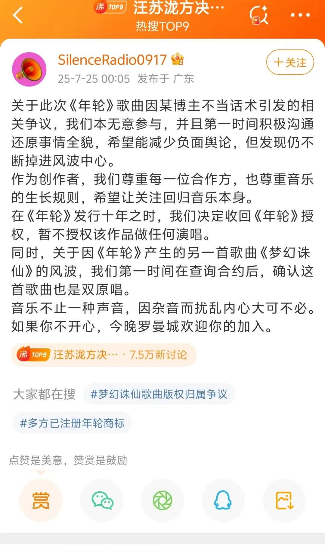 娱乐圈就这么大,还互相合作过,闹这么难看对谁都没好处,只能说张碧晨真是傻! 汪苏泷在综艺节目中多次提到版权问题,自己唱歌都不超过三句;还明确提出《年轮》这首歌除了张碧晨不是他的,剩下全是他的;结果张碧晨工作室还要硬刚,真不是一般的丢脸啊! 众所周知的事非要抢,真是上脸至极!