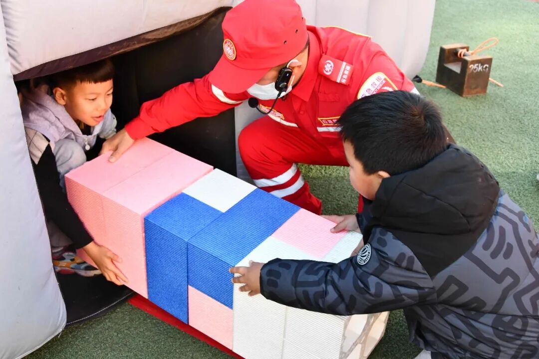学生在充气模拟地震废墟空间,实际体验如何在极端灾害环境下进行自救互救。