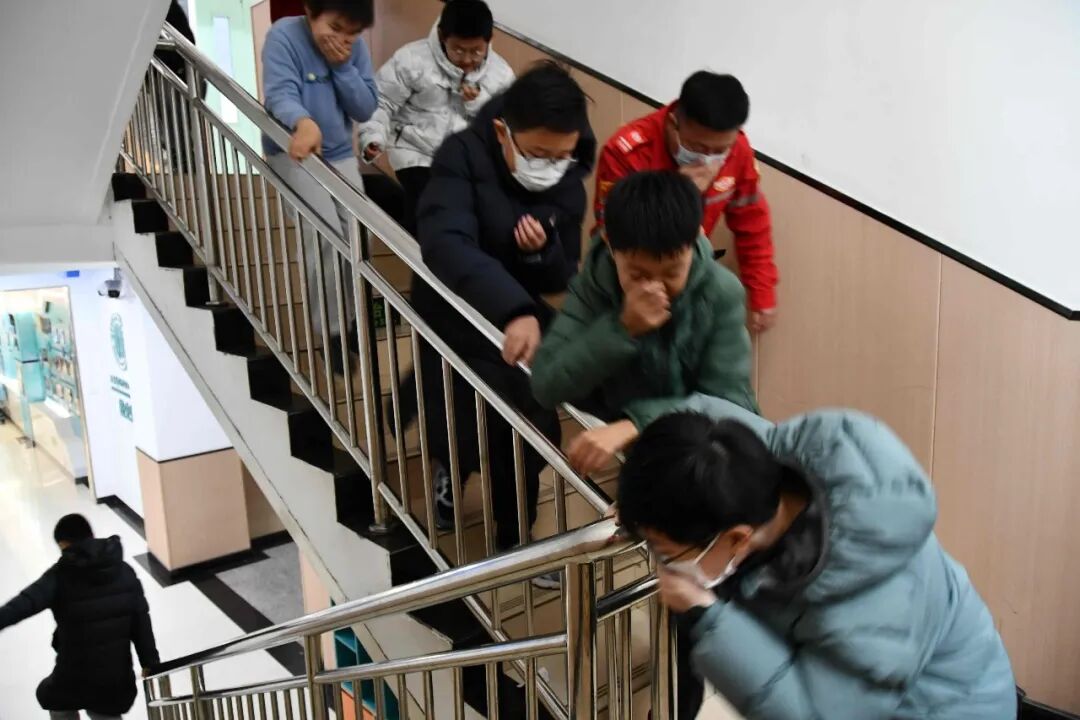 随着响亮的报警声响起,各年级各班同学在老师的带领下,有序从最近的楼道“逃生”,以最快的速度来到“应急避难场所”——学校操场。