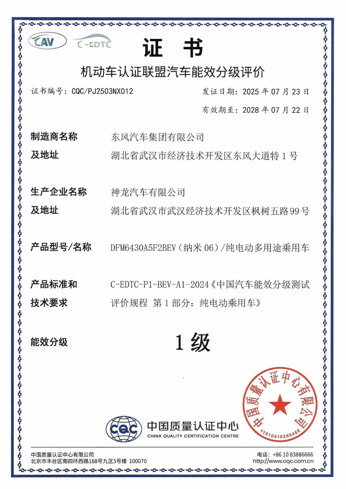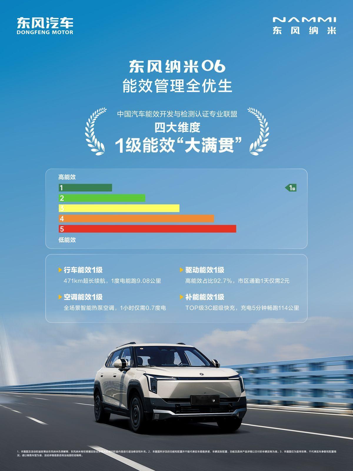 国家队这次真的上大分!A0级精品车东风纳米06领先同级,率先斩获中国质量认证中心盖章的一级能效认证,行车、空调、驱动、补能四大核心维度均获得一级能效认证,什么实力不用多说了吧? 和东风纳米06同批参测的车型可都是小鹏P7+、极氪7X这种20万级的车型,可见东风纳米06的越级品质。而且,东风纳米06获得这几个能效一级认证,对于我们平时用车体验的提升是非常直接的。比如这个补能能效一级,用更直接的数据来看,充电5分钟就可以补能114km,在服务区买个饮料的时间,电就充上了,这背后是东风纳米06拥有同级领先的3C快充技术+CTP直冷电池包,峰值充电功率可以达到154千瓦,这效率完全不输一些800V的车啊,基本没有续航焦虑。 所以说低价并不意味着低质,东风纳米06背靠央企,有强大的技术底蕴和规模效应优势加持,在10万级价位就给出了不输20万+的体验,堪称超值之选。