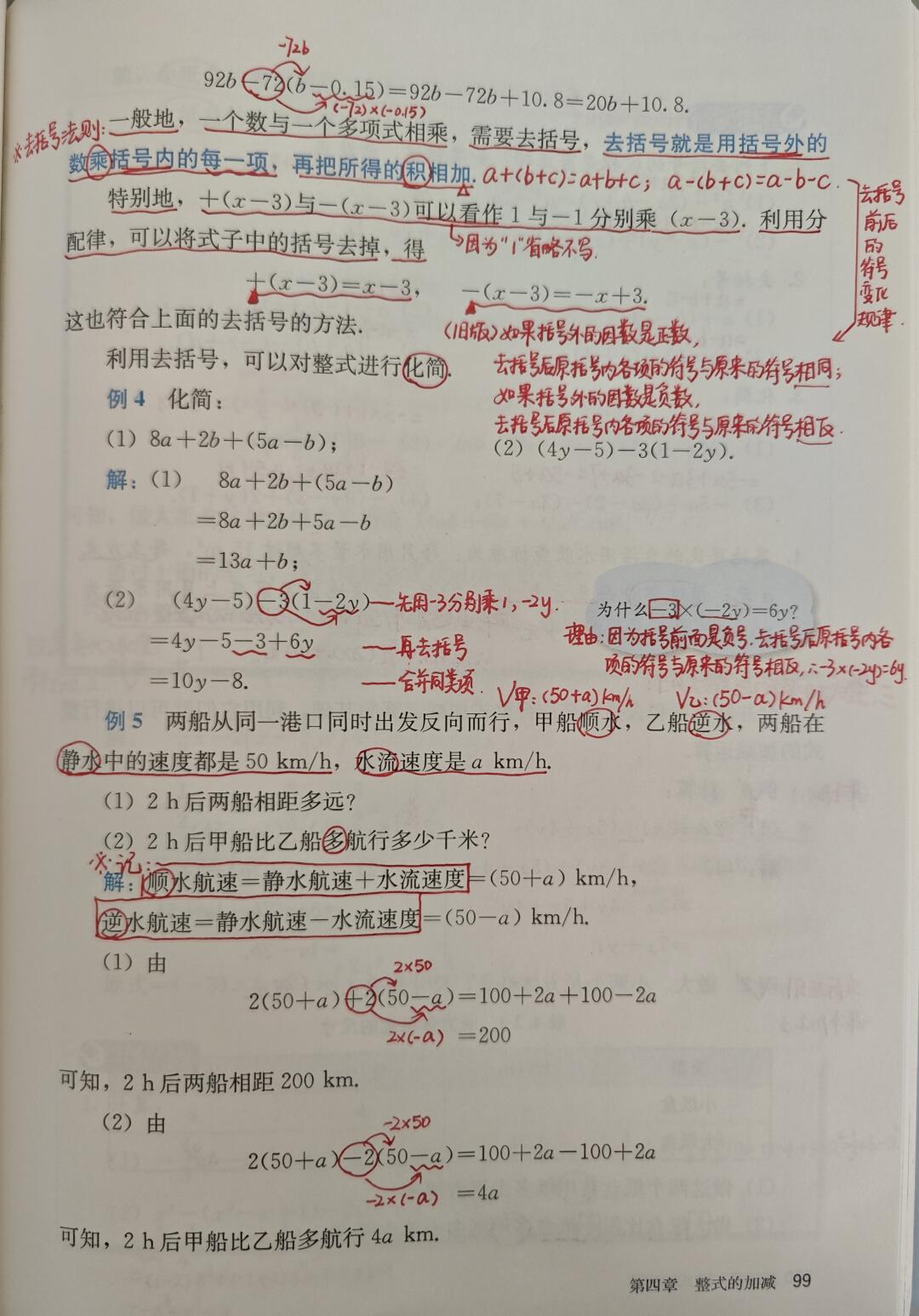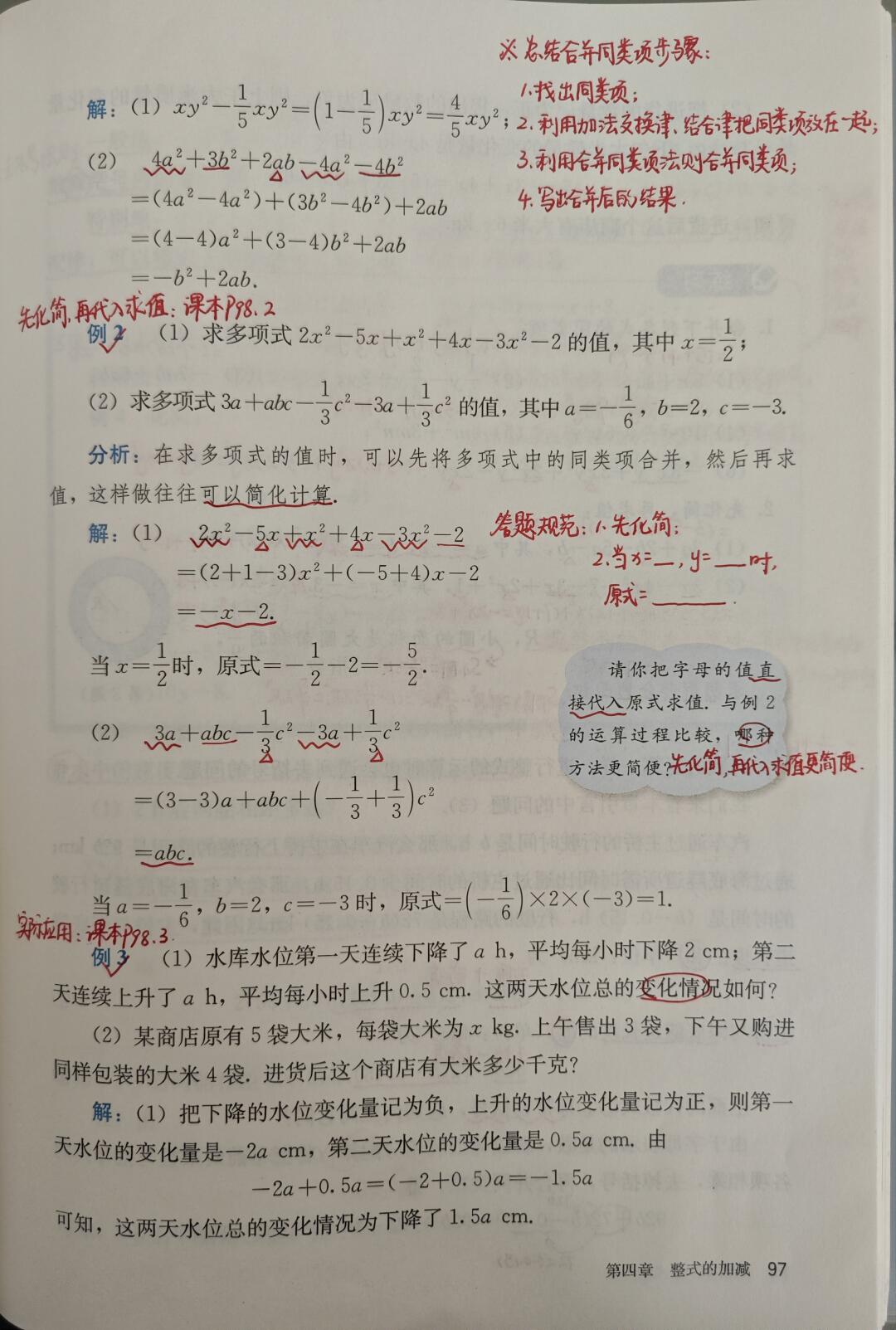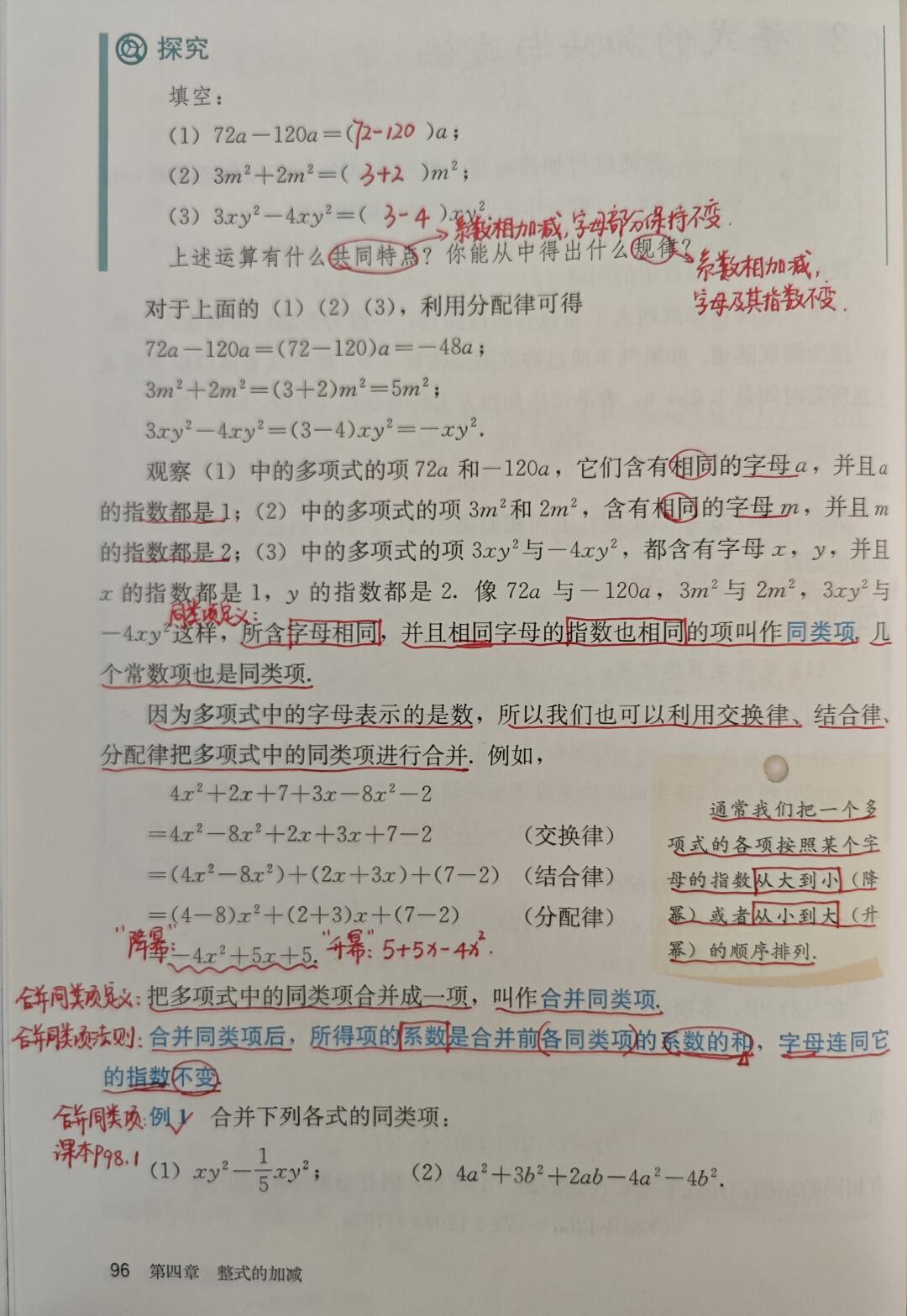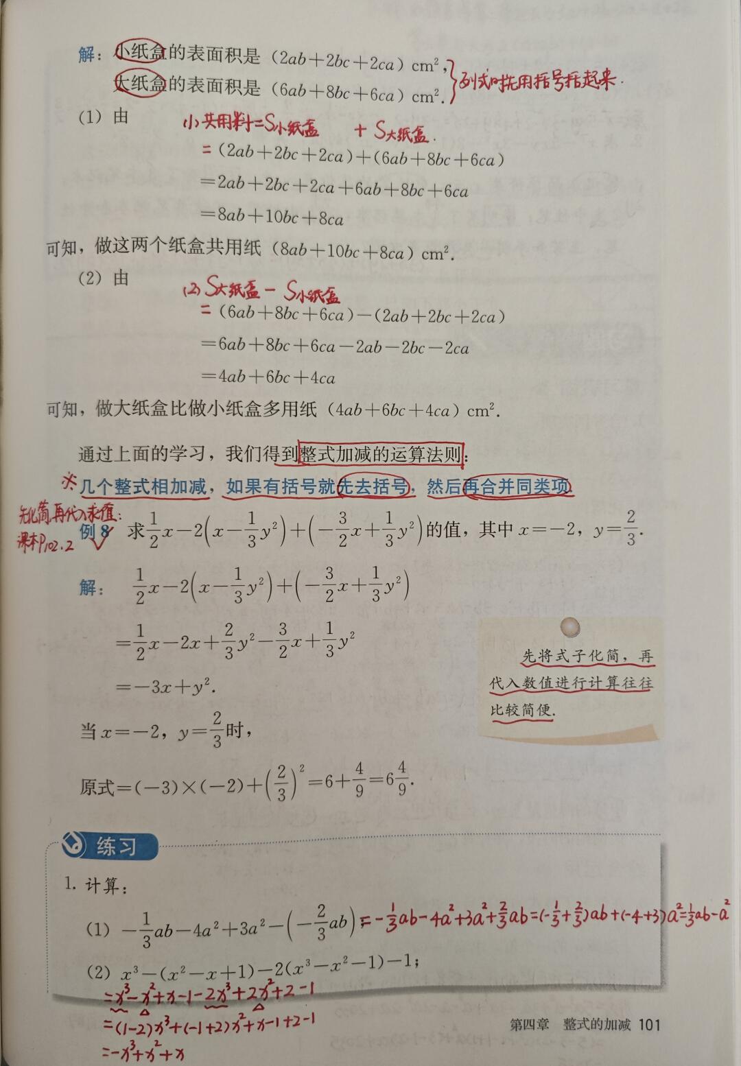 本节课内容较多,分为合并同类项法则、去括号法则、整式加减运算法则三个内容。四个字:练就对了。