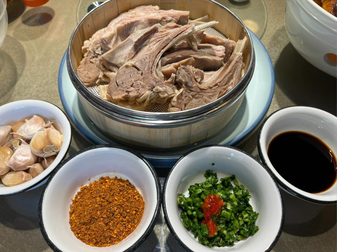 手抓羊排,宛若一柄大斧头,我赠之外号“战斧羊排”,可感受羊肉大快朵颐之美感。蘸料做了本地化的改良,有四样,现炒的辣椒面、调制的醋汁儿、韭菜桂林辣酱以及北方人超爱的新蒜,可降低羊肉的肥腻。