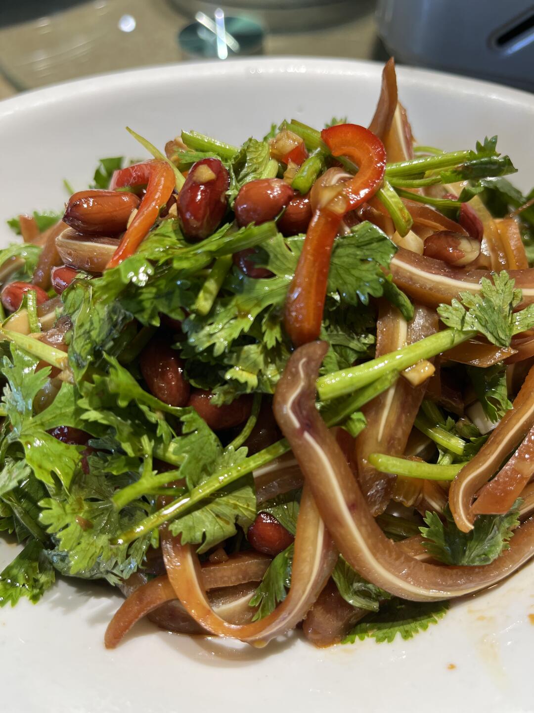 沙葱,也叫“蒙古韭”,一种类似野韭菜和野葱的植物,生长于宁夏戈壁滩,是考验一家宁夏馆子正宗与否的重要标志。鱼小杨的沙葱,采取先冰后凉拌的方式,口感微微辛辣,但冰镇过后更多是一种甜香,给了一点千张、红椒丝,色彩艳丽,惹人喜爱。