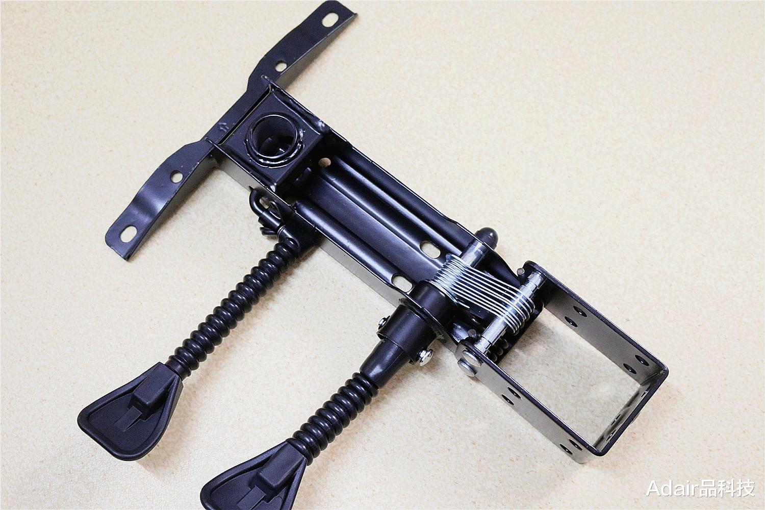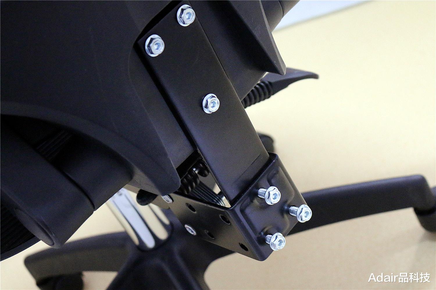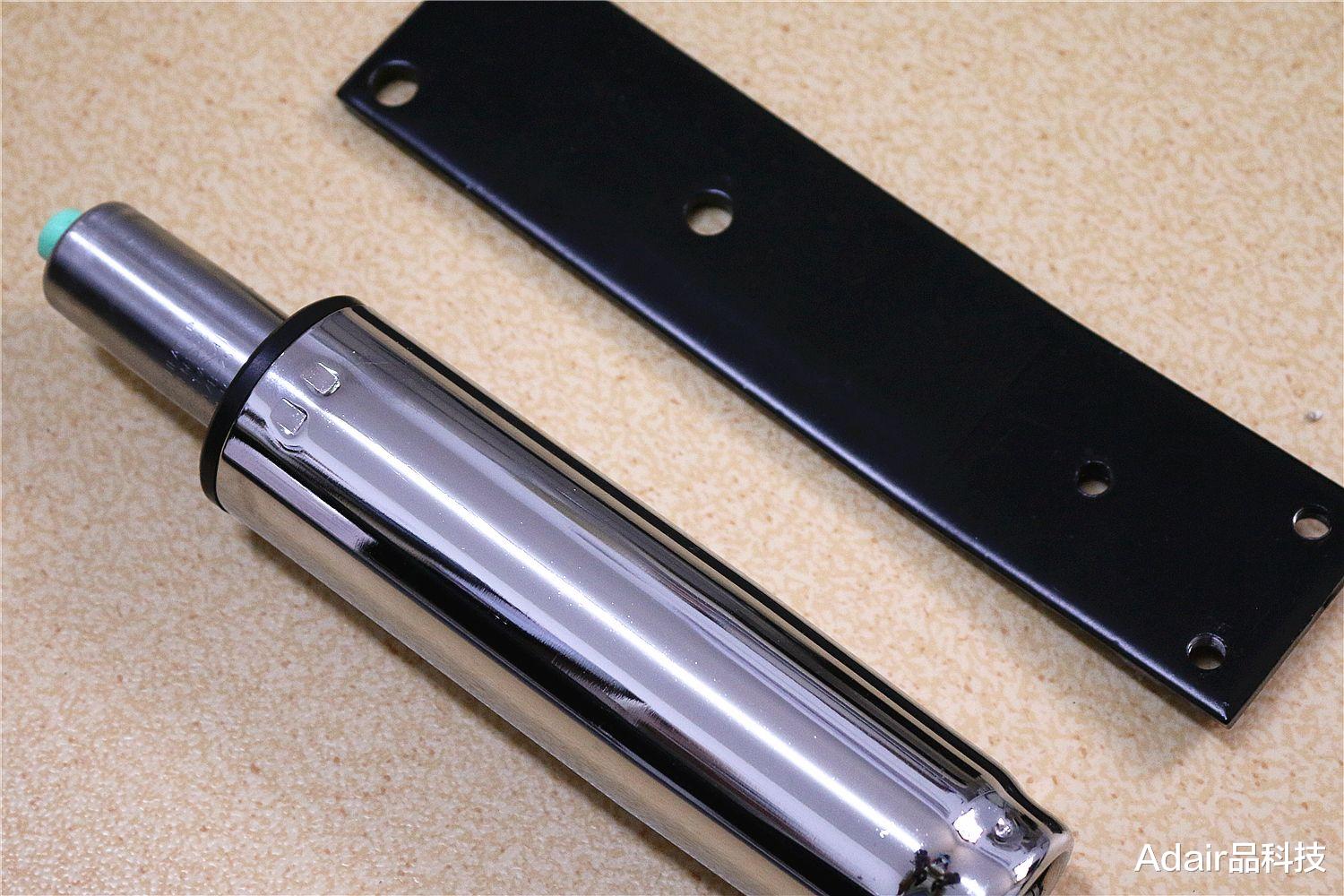 核心部件的特写,上面是4级防爆气压杆和高强度钢板。下方是的升降和角度调节件,用料都非常扎实,表现光滑。钢板的尺寸约为55mm宽,7mm厚,非常厚实。