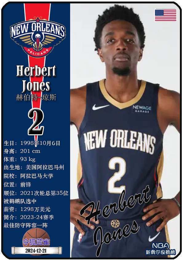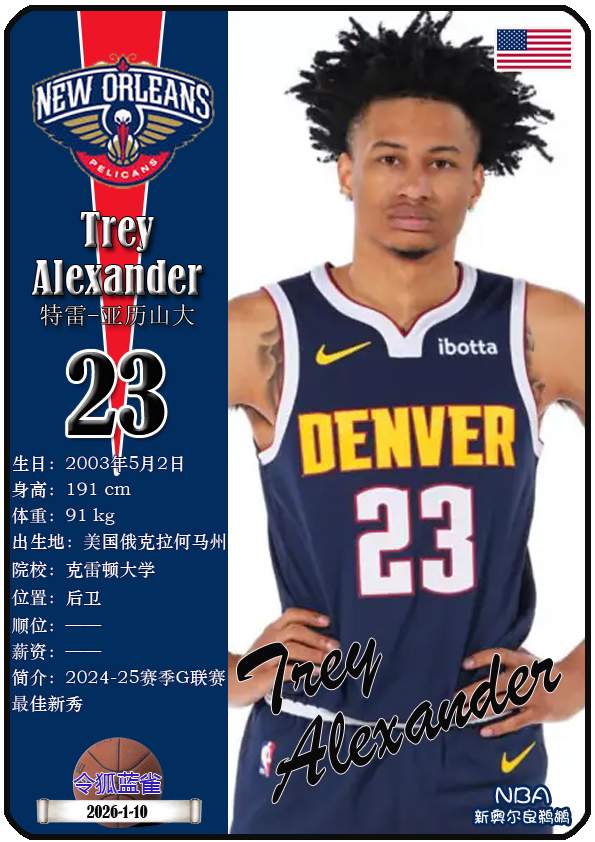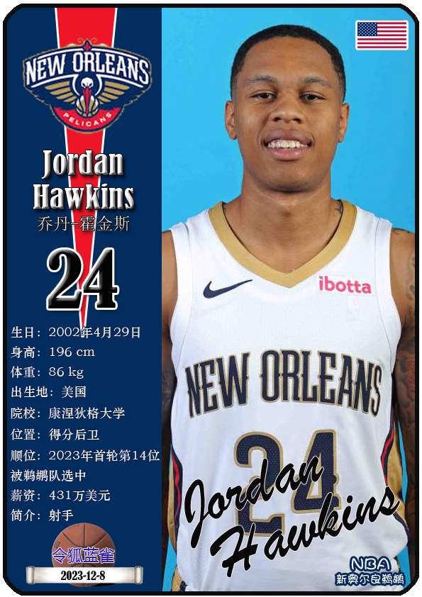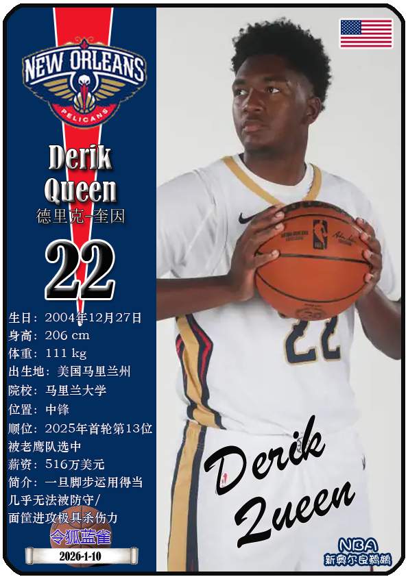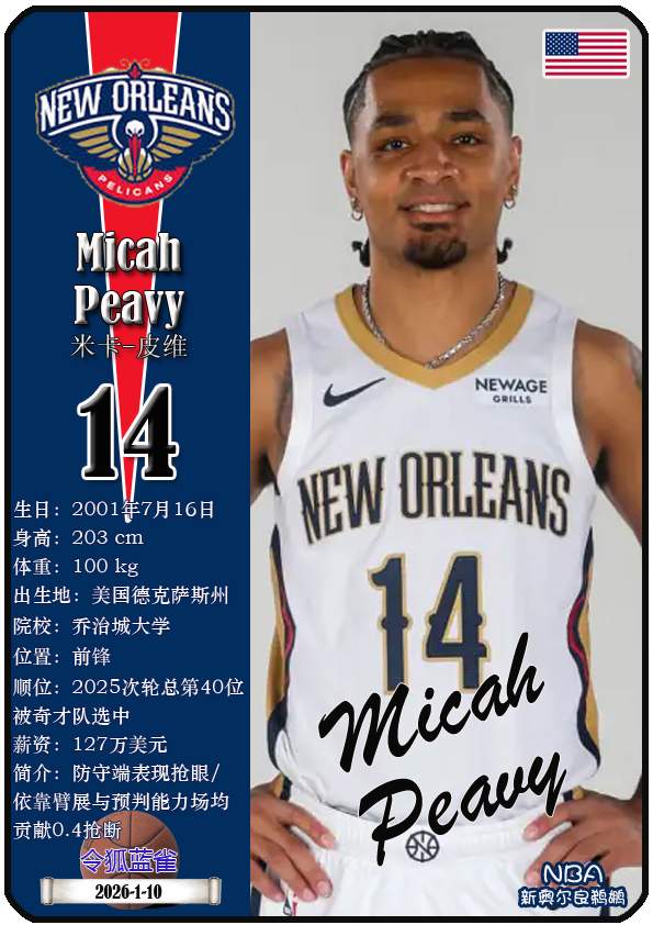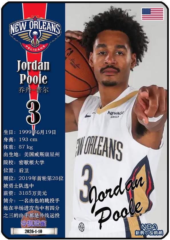 NBA新奥尔良鹈鹕队原为新奥尔良黄蜂队,2013年1月正式宣布球队改名为鹈鹕队,距今已有13年。截至2026年1月10日,球队主教练是詹姆斯·博雷戈,队内拥有球员锡安-威廉森、特雷-墨菲三世、乔丹-普尔等。本期以球星卡的形式展示目前NBA新奥尔良鹈鹕队的18名球员(按球衣号码排序):