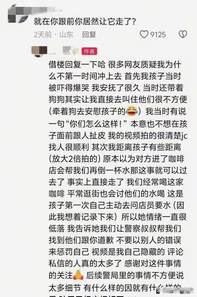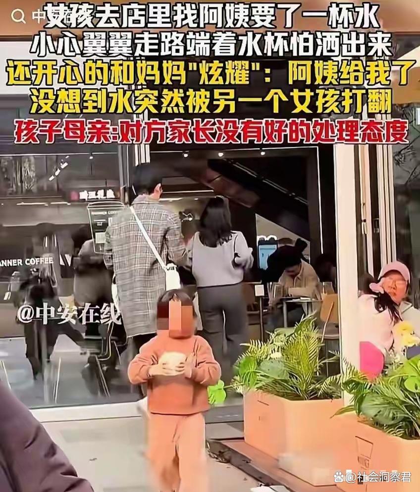 最让人愤怒的是涉事家长的态度。这位妈妈就在三米之外,事发时虽然喊了孩子的名字,却根本没有伸手阻拦,眼睁睁地看着自家孩子闯了祸。之后,她慢悠悠地走过来,轻描淡写地说了句“孩子闹着玩呢,水又不烫”,连问都没问对方孩子有没有受伤,就拽着自家孩子钻进了旁边的咖啡店。