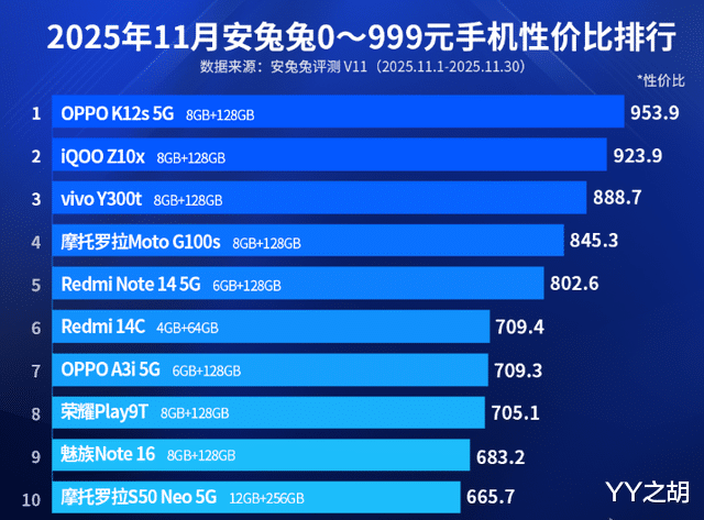 最后,在安兔兔2025年11月份0—999元手机性价比排行榜中,OPPO A3i 5G和荣耀Play 9T分列第七名和第八名。在安兔兔平台上,这两款智能手机的性价比评分分别为709.3分别和705.1分。在此之后,魅族Note 16和摩托罗拉S50 Neo 5G分列第九名和第十名。在安安兔兔平台上,这两款智能手机的性价比评分分别为683.2分和665.7分。其中,魅族Note 16的正面配备一块 6.78 英寸 2460x1080 分辨率 120Hz 打孔 LCD 面板(亮度至高 1050 尼特),提供 8MP 自拍摄像头。