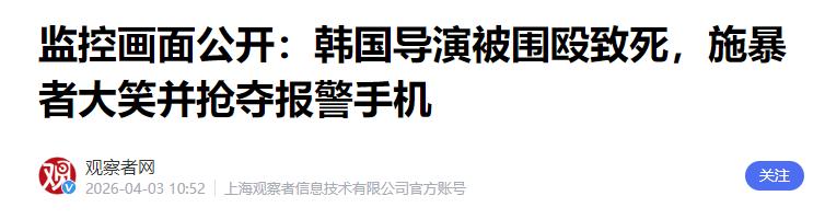 观察者网《监控画面公开:韩国导演被围殴致死,施暴者大笑并抢夺报警手机》