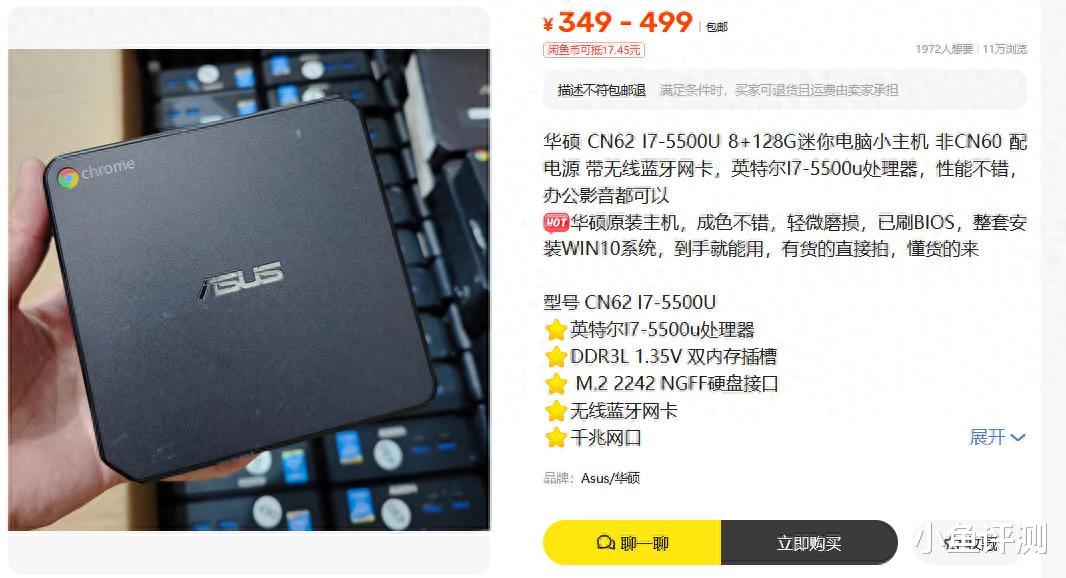 其实很多需求根本用不上那么高的性能。今天我就在二手鱼刷到了一台华硕CN62迷你主机。别看它现在不起眼,当年也是坐办公室隔间里的白领精英呢。核心就这几样:i7-5500U的CPU,8G内存,配个128G或256G的固态硬盘。我懂,你肯定想:“这U都古董了吧?”