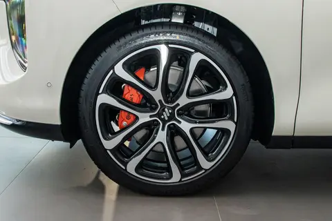 侧面线条我觉得是整个车最有设计感的部分。智己LS6(用车口碑)延续了品牌标志性的溜背造型,这种设计在保持SUV实用性的基础上,赋予了整车类似轿跑的灵动身姿。它的车身线条流畅自然,就像一滴水滑过玻璃的轨迹,既柔和又有力量感。无框车门和隐藏式门把手的设计不仅提升了整车的科技感,也让侧面造型非常干净利落。特别是配备的ISC智慧灯语系统,这个配置很有趣,能在车门下方投射动态光效,晚上下车那种仪式感很强,也体现了厂家的细节用心。轮毂换装了20英寸的锋银运动轮辋,搭配橙色刹车卡钳,视觉冲击力很强。车轮转动起来的时候,像是跳动的火焰一样,运动气息瞬间拉满。车尾设计同样简洁利落,“小鸭尾”尾翼和简洁的后包围相互呼应,整个车尾看上去既干练又有力量感。掀背式电动尾门的加入,实用性也很强,日常上下东西非常方便。