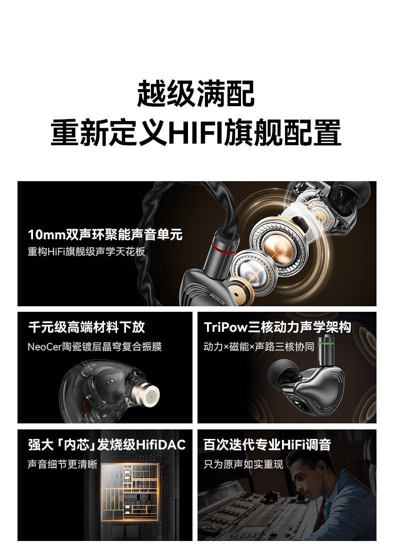 核心振膜采用千元级高端材料才有的 NeoCer钛晶复合材料,通过微纳层叠技术构建出超薄而高强度的振膜骨架,显著抑制分割振动与边缘共振,在高频延展、瞬态响应和失真控制方面表现更出色,在开放式声场中依然具备清晰通透、细节丰富的声音还原力。配合 TriPow三核声学驱动体系,实现驱动力、磁通量与声路导向的三重协同,带来更干净、更具冲击力、更接近录音室实声的听感表现。