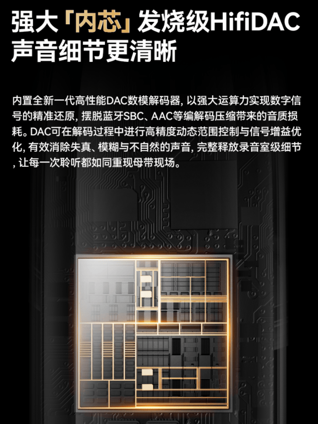 内部搭载全新高性能 DAC 数模解码芯片,凭借强大算力精准解析数字信号,有效避免蓝牙常见的压缩损耗与细节丢失。同时依托 Xisem 声学实验室的严苛验证,对腔体结构、振膜与驱动系统进行了深度模拟与调优,使整体声音更自然清晰、细节丰富饱满。