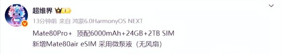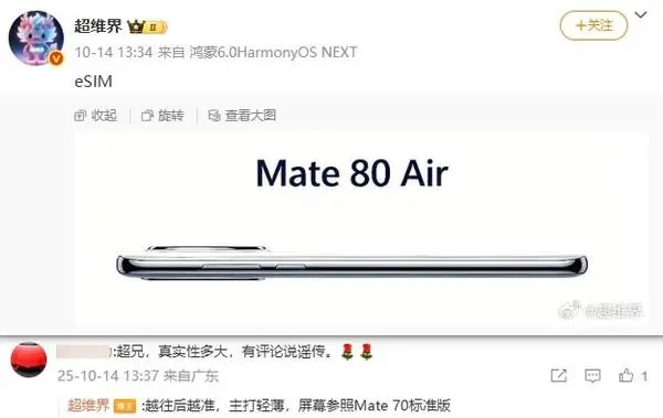 近日,数码博主“超维界”再次曝出华为Mate 80 Air新机的新料,根据其曝光的信息看,该机不但主打轻薄设计,而且还将支持eSIM,根据目前华为发布的手机产品来看,该机也将会是华为旗下首款支持eSIM的手机产品。同时,在与网友互动时,该博主还称,“越往后越准,主打轻薄,屏幕参照Mate 70标准版”。