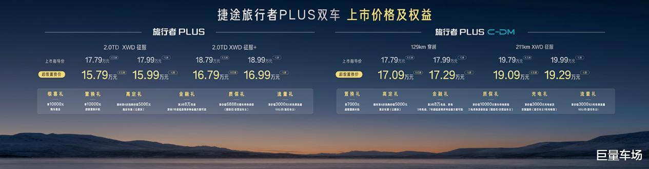 捷途旅行者PLUS提供2.0TD XWD征服、2.0TD XWD征服+两款配置,官方指导价17.79万元至18.99万元,超级置换价15.79万元至16.99万元。捷途旅行者PLUS C-DM推出129km穿越、211km XWD征服两款配置,官方指导价17.79万元至19.99万元,超级置换价17.09万元至19.29万元。