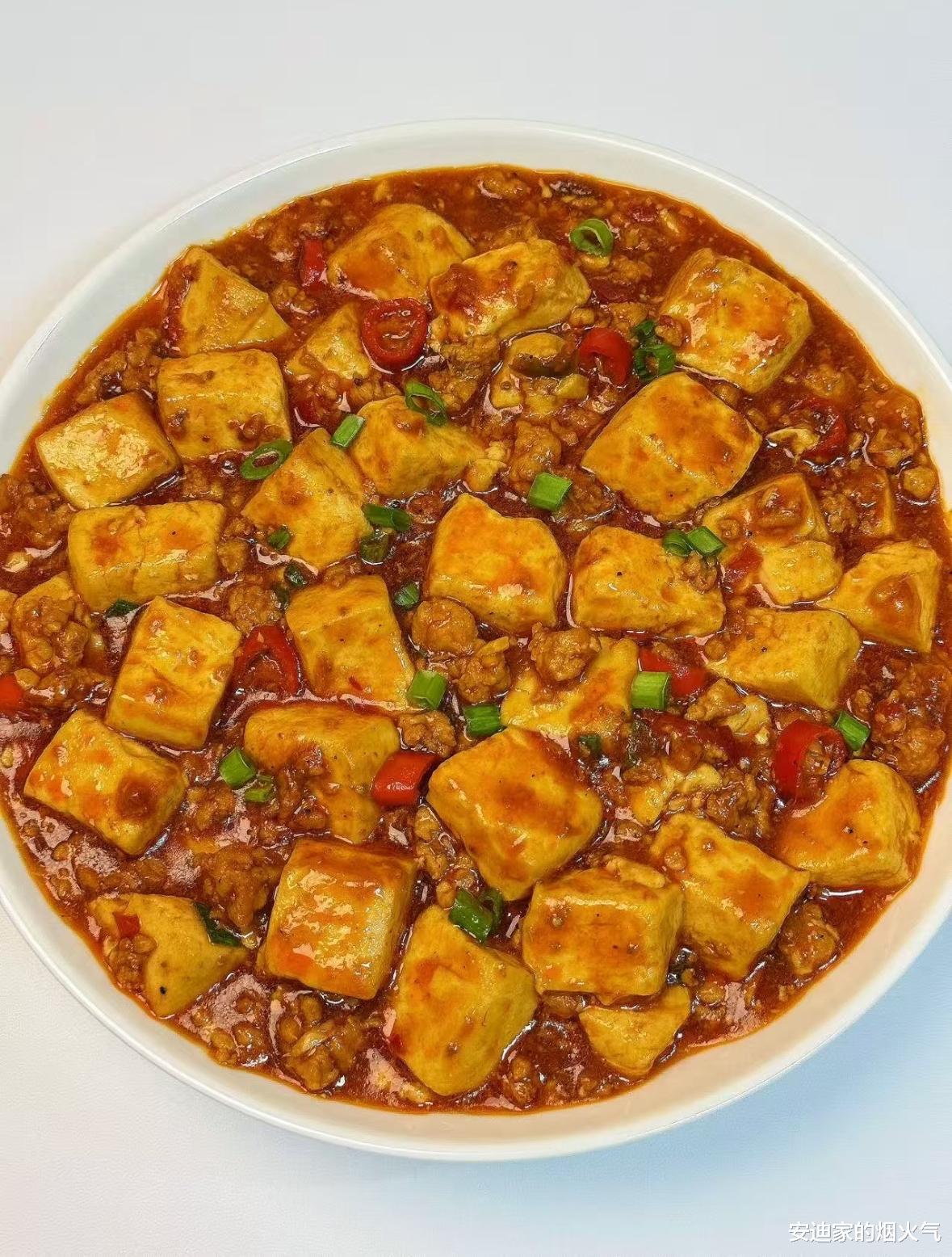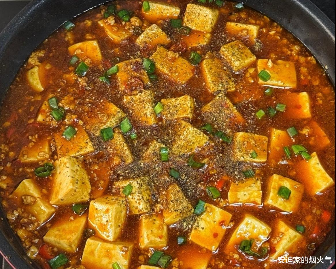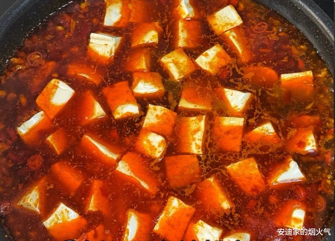 香味炒出来后,往锅里倒入一碗清水,大火煮开后,加入生抽提鲜、老抽上色、白糖中和辣味,简单几味调料就能调出醇厚悠长的底味。这时把焯好水的豆腐轻轻倒进锅里,再淋上一碗提前调好的淀粉水,转小火慢煮一会儿。让豆腐在浓稠的汤汁里慢慢浸润,每一个缝隙都吸饱麻辣鲜香的滋味,原本清淡的豆腐瞬间变得鲜活起来。