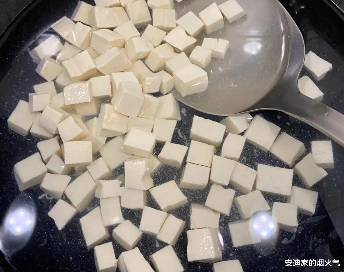 1. 豆腐切成1厘米见方的小块,冷水下锅加少许盐,大火煮2分钟后捞出沥干备用