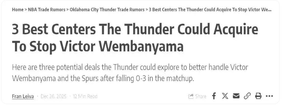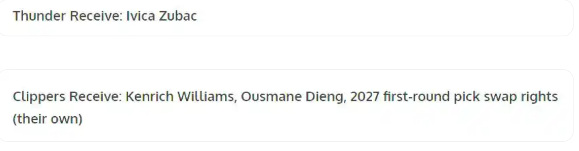 在更现实的版本中,交易可能升级为:快船送出祖巴茨 + 放弃2030年受保护首轮;雷霆送出肯里奇·威廉姆斯、乌斯曼·迪昂、2026年快船首轮签、2027年首轮互换权。