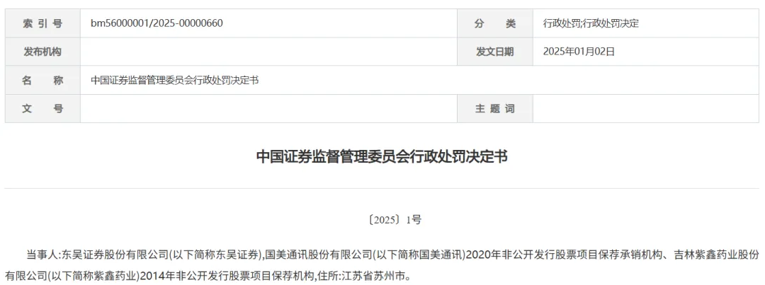 值得关注的是,通宝光电的保荐机构东吴证券此前就曾因未勤勉尽责而受到重罚。2025年1月,证监会向其送达行政处罚决定书,指出东吴证券在为国美通讯2020年非公开发行股票提供保荐承销服务,以及为紫鑫药业2014年非公开发行股票提供保荐服务过程中,未能履行勤勉尽责义务,所出具文件存在虚假记载。监管决定对东吴证券责令改正、给予警告,同时就国美通讯保荐及承销项目罚没715.04万元,就紫鑫药业保荐项目罚没620.4万元,东吴证券被罚没金额合计超过1300万元。