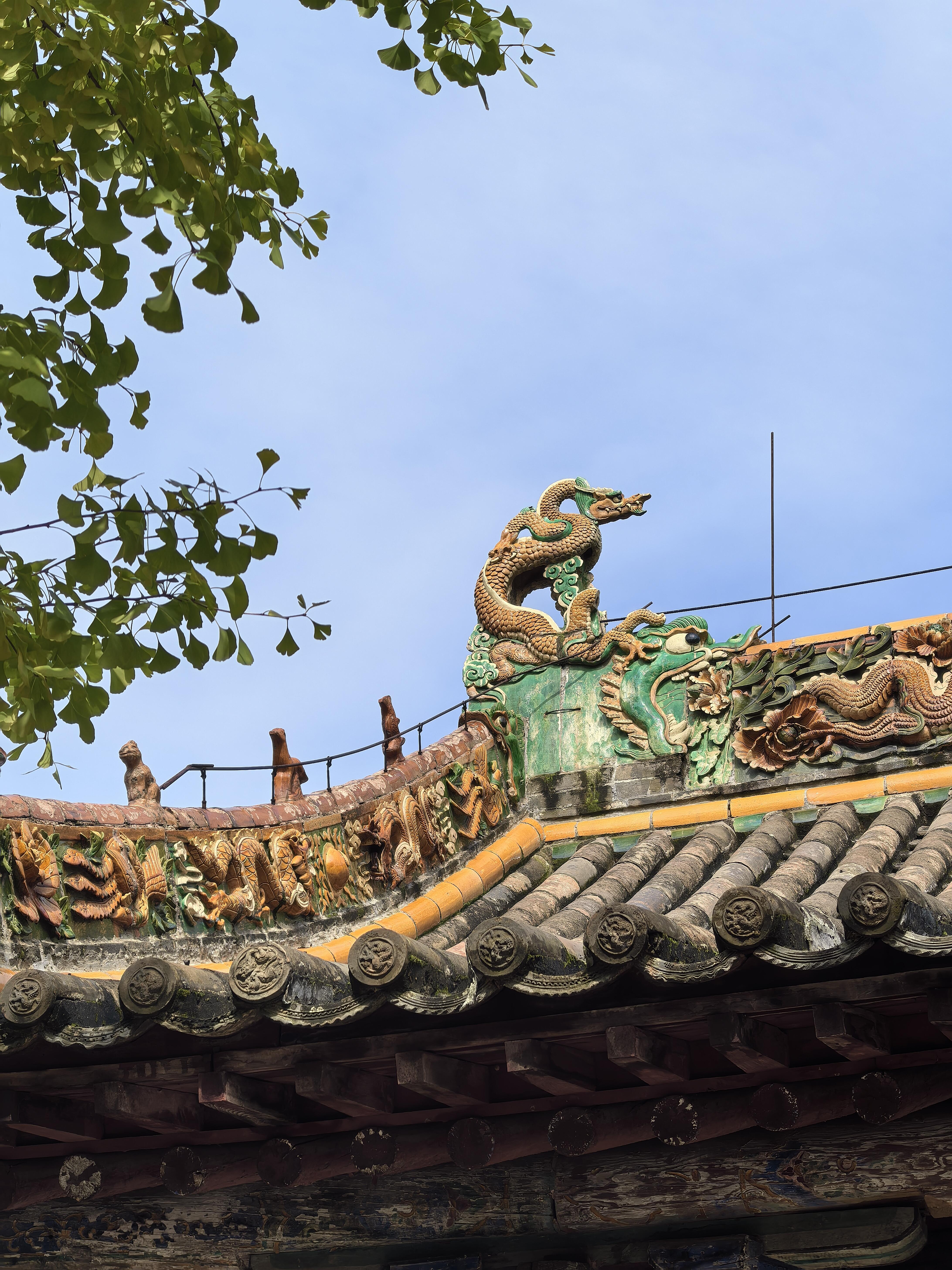 雷音殿是定林寺的核心建筑,元代的木构框架依旧完好,殿顶的琉璃构件却是金代的遗物。这不禁让人猜想,这座大殿是否在金代便已初具规模,元代又进行了重修?琉璃构件的色彩依旧鲜艳,黄、绿、蓝三色交织,在阳光下泛着柔和的光泽。脊兽的造型生动逼真,仿佛下一秒就要腾空而起。殿内的斗拱比山门的更为厚重,层层叠叠,如云朵簇拥,展现出元代木构的雄浑大气。站在殿内,抬头可见梁架上的彩绘,虽已模糊,却依旧能辨认出当年的色彩,那些简单的线条、朴素的色彩,却比任何繁复的装饰都更能打动人心。