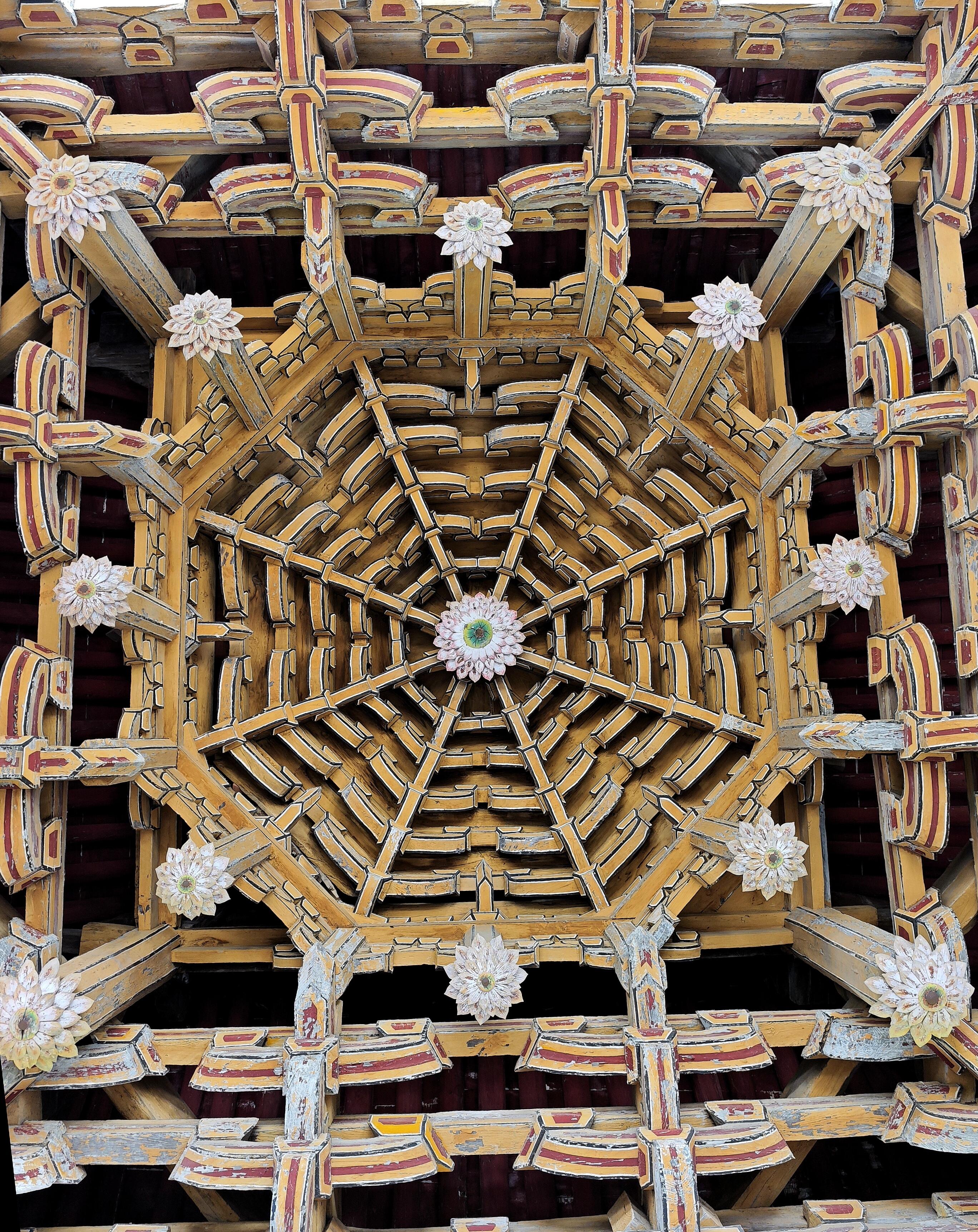 站在藻井之下,忍不住会想,当年建造这座山门的工匠,是怀着怎样的心境?他们或许没有留下姓名,没有留下生平,却用手中的刻刀、心中的敬畏,把对天地的理解、对美的追求,都融进了这一方木构里。元代的风曾穿过山门,吹过斗拱的缝隙;明清的雨曾打湿窗棂,润过琉璃的花瓣;民国的炊烟曾缭绕在古寺上空,与藻井的影子重叠。七百年间,朝代更迭,人事变迁,唯有这方藻井,依旧保持着最初的模样,沉默地见证着世间的沧海桑田。它不像那些声名显赫的古建,被无数镜头聚焦,被无数文字颂扬,它就这么安安静静地待在定林寺的山门之上,等着有缘人抬头,等着有人能读懂它木骨里的深情。