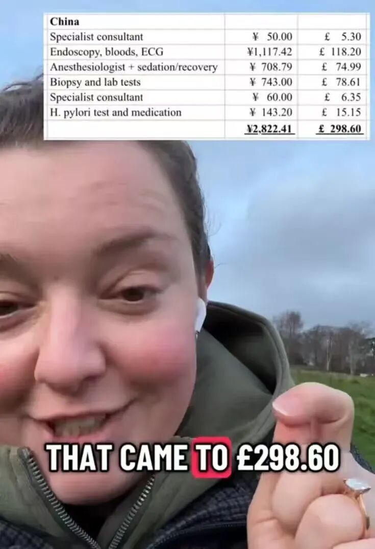 下图:英国网红艾米被胃痛折磨了两年,她已经在英国交了五年医疗保险,想要走英国“免费医疗”流程。但由于迟迟轮不到她,被病痛折磨到受不了的艾米决定飞到中国治病。到北京第二天,艾米就在医院做了胃镜检查,并被医生确诊是慢性胃炎与反流性食管炎,才导致长期胃痛。在经过12天治疗后,艾米的病痛得到了有效控制,而全部只花费了2800元人民币。但倘若要在英国私立医院治疗,光内窥镜一项可能就要花费3000至5000英镑,而且何时能排队治疗还是未知数(图源:正解局)