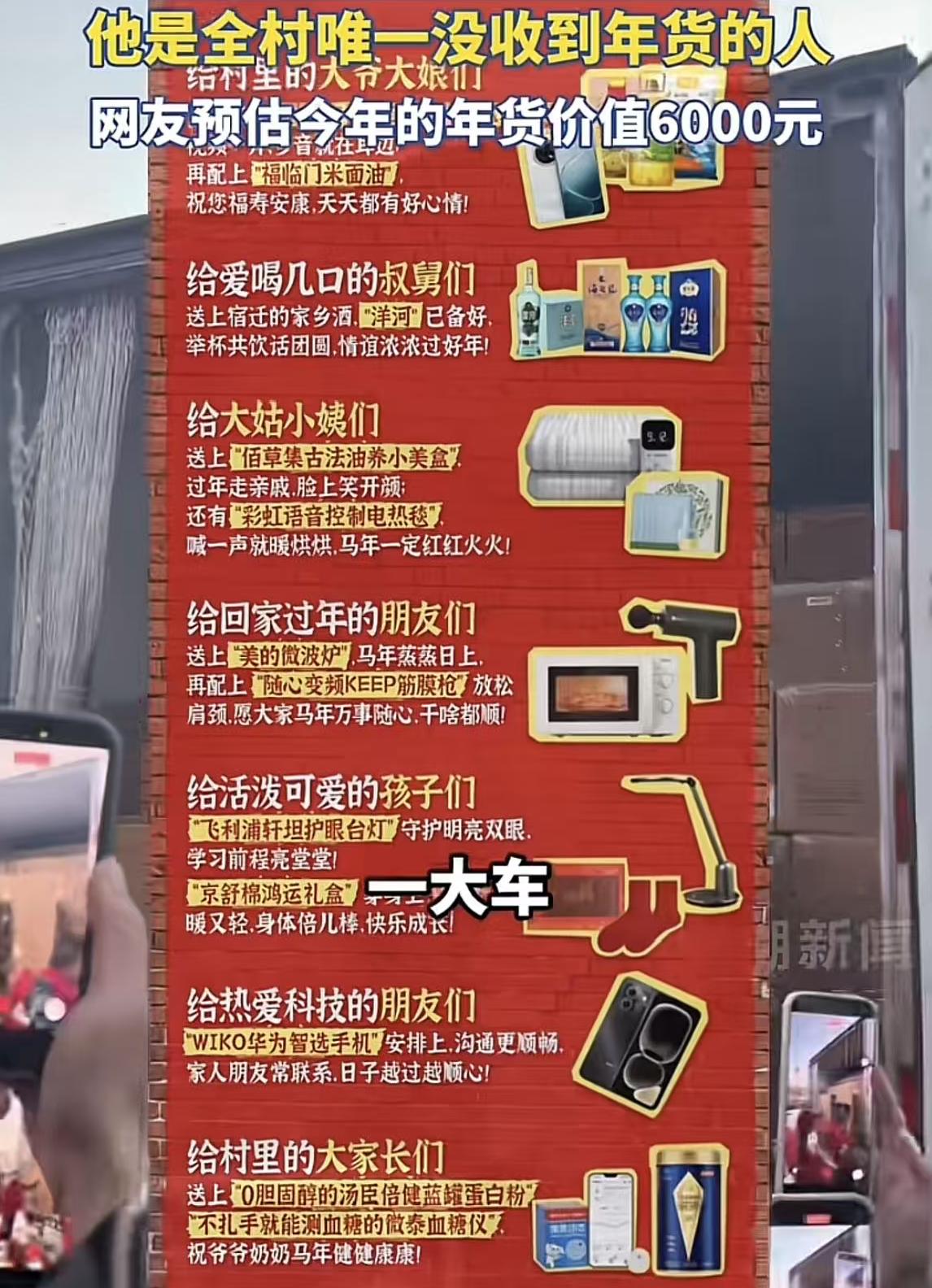 从他的年货清单,也能看出时代的变化,从一开始的鸡鸭鱼肉,到现在的电子产品,家乡的老人也跟着与时俱进了。