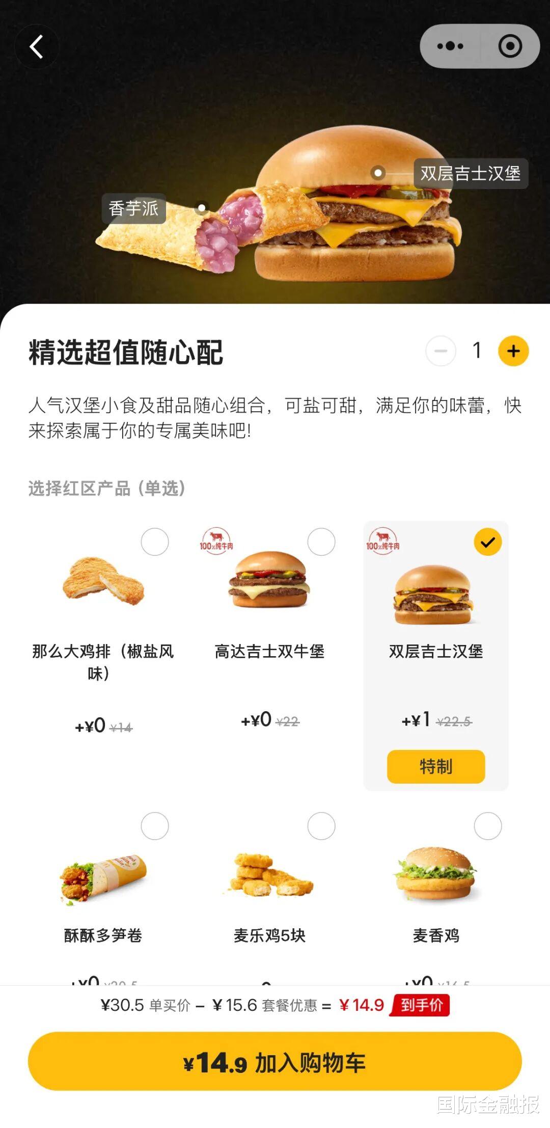不过,被网友戏称为“穷鬼套餐”的“1+1随心配”仍维持13.9元起的定价,但热门组合出现变相涨价,即若选择双层吉士汉堡作为套餐搭配,则需在原有售价基础上额外加1元至14.9元,不选择“特制”食品的组合则保持原价。